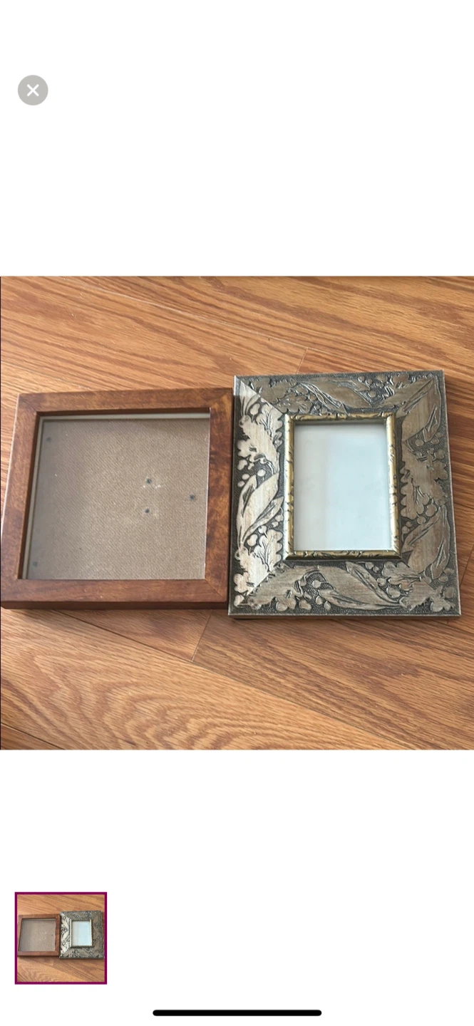 Selling two decorative picture frames! One has a wooden finish and the other has a gold finish with a floral pattern. They're perfect for adding a personal touch to your space.