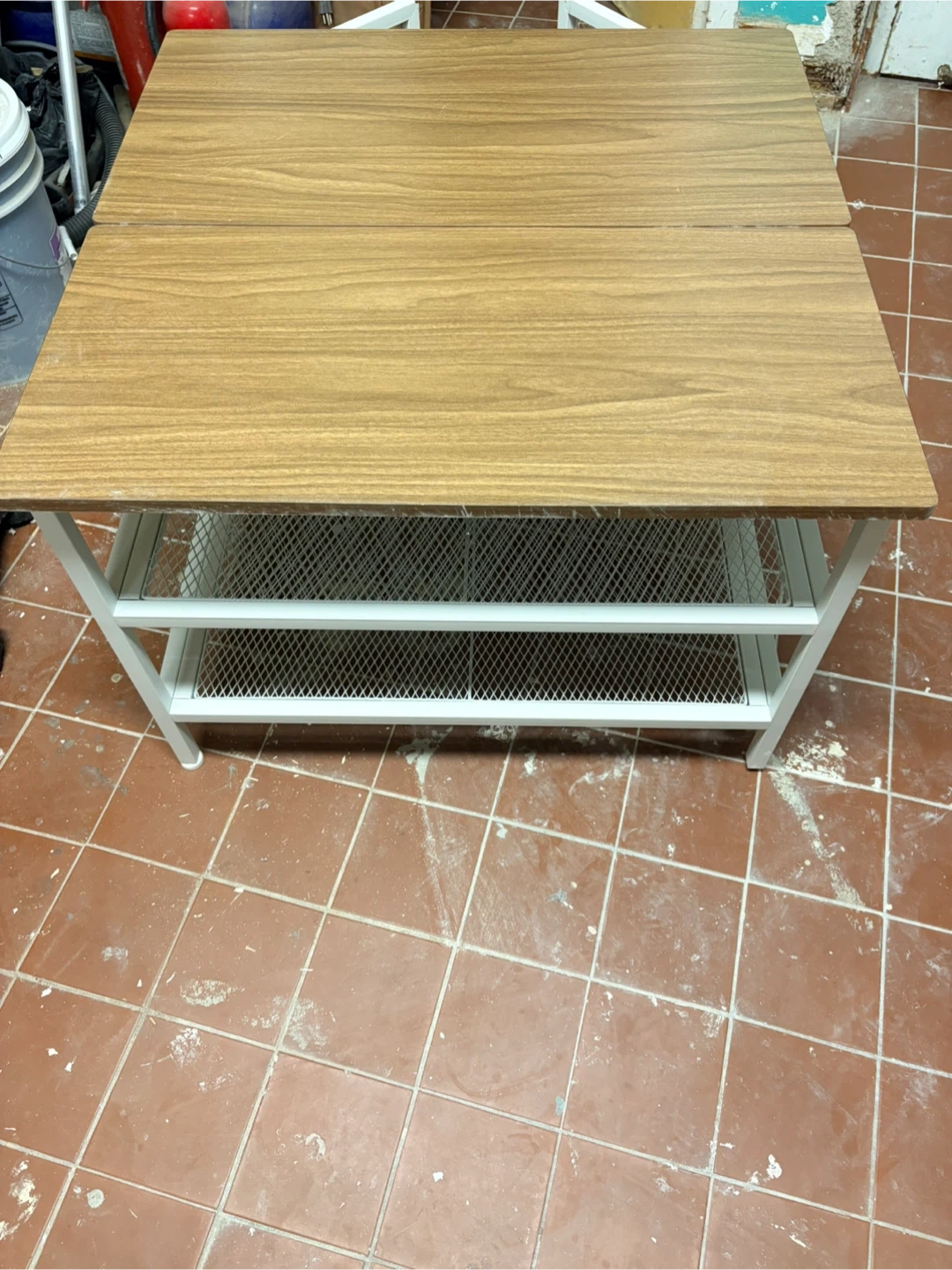 Selling a lift-top coffee table. It's in great condition and features a wood-look top with a white metal frame. The lift-top design is perfect for working from home or enjoying a meal in front of the TV. It also has a convenient storage area underneath!