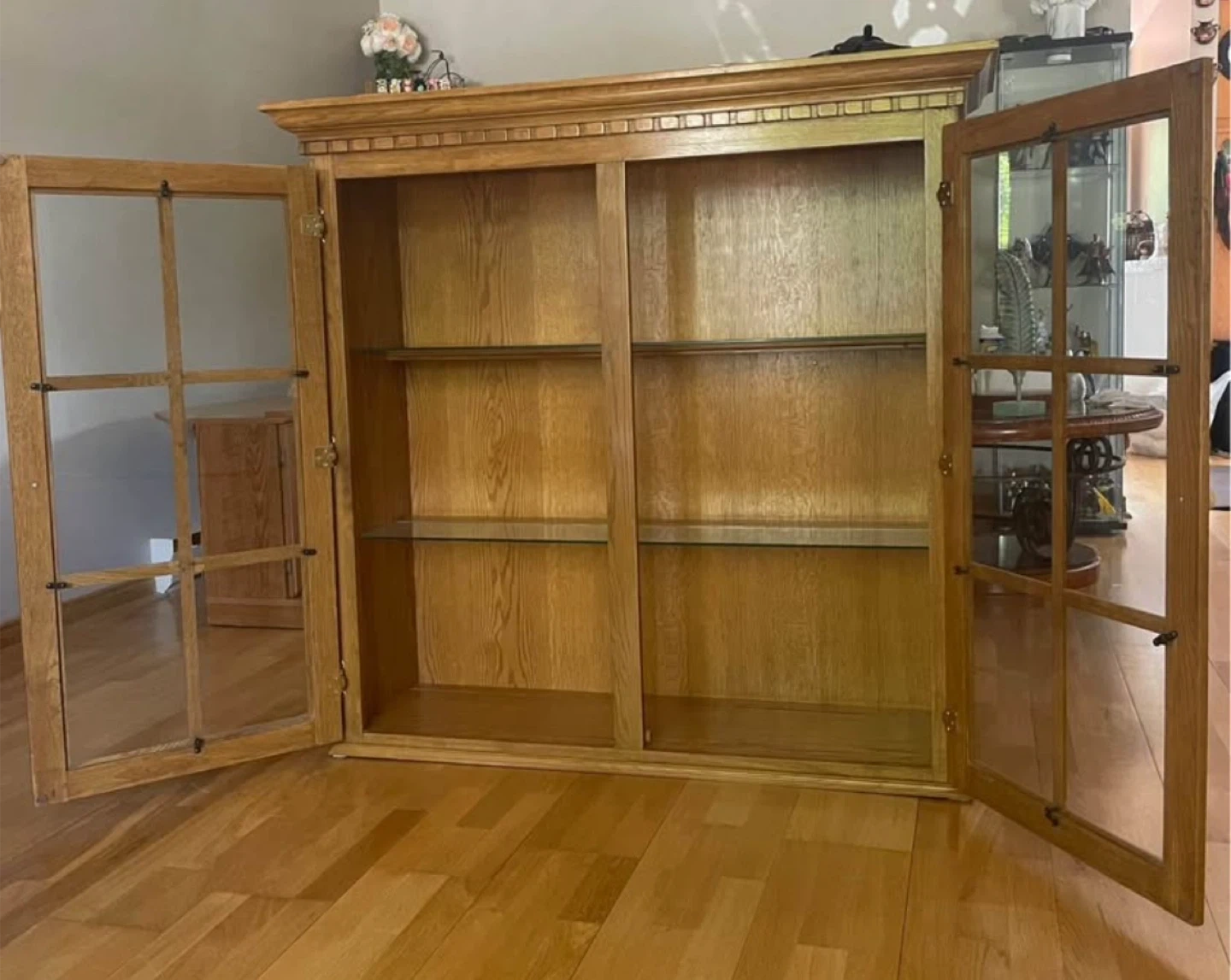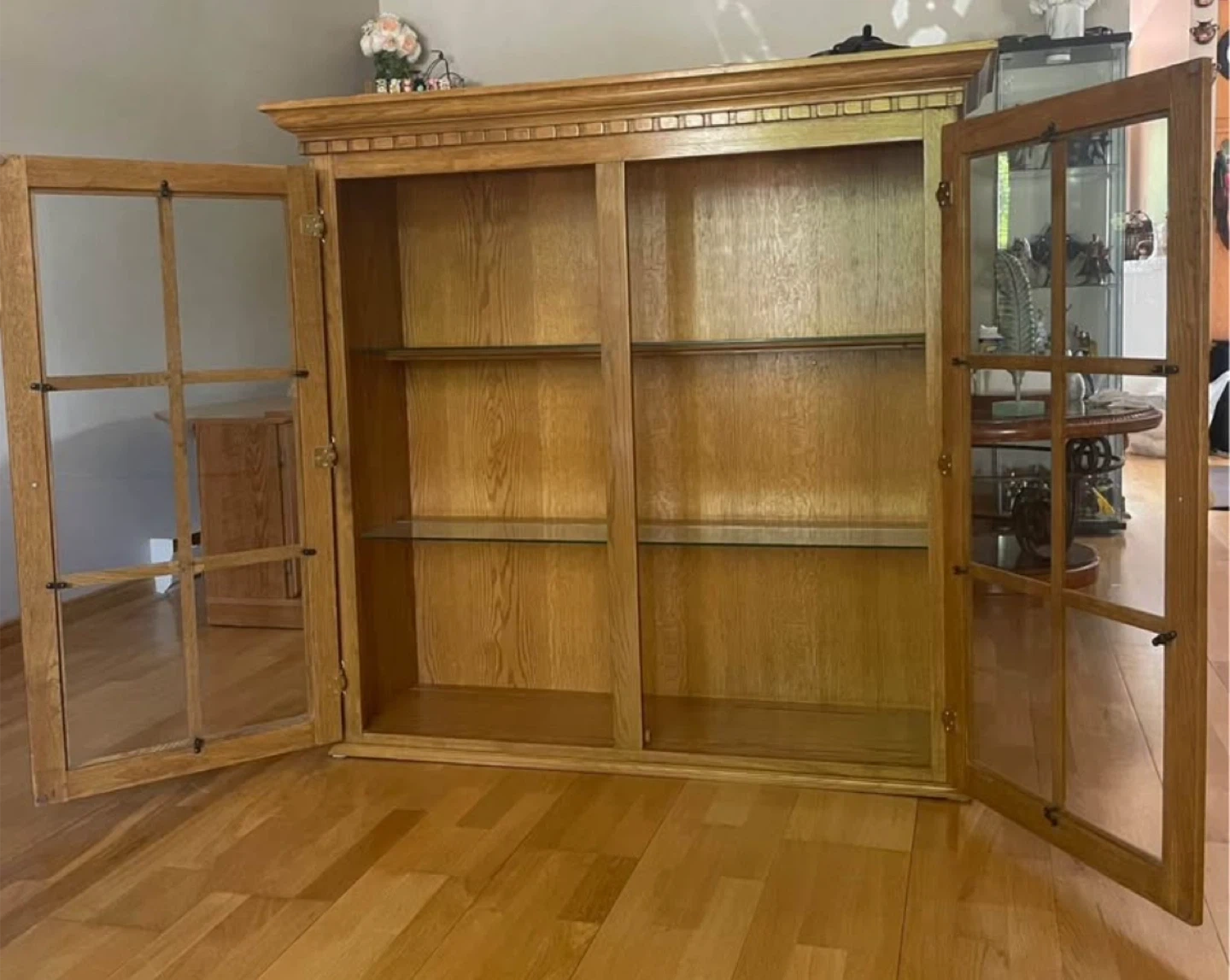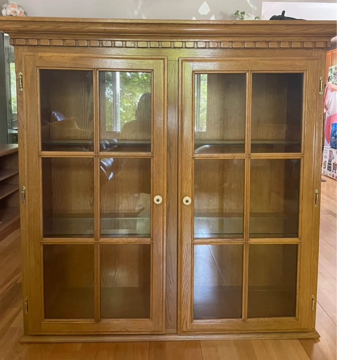 Beautiful and sturdy solid hutch in excellent condition. Features two glass-panel doors with interior shelving (perfect for displaying dishes, collectibles, or books). It suits any dinning room, living space, or kitchen. Dimensions W 123cms x D 38cms x H 118cms