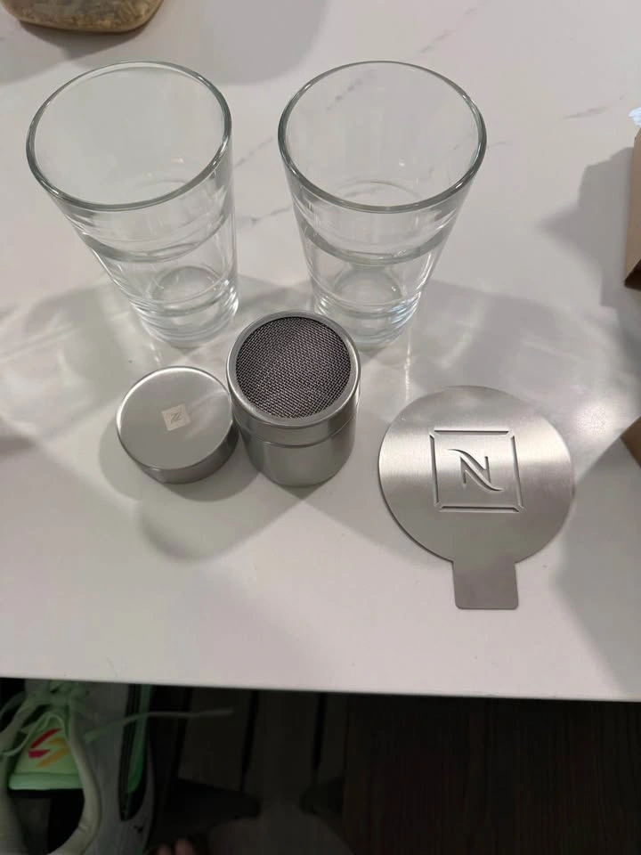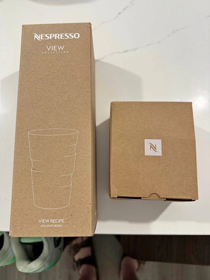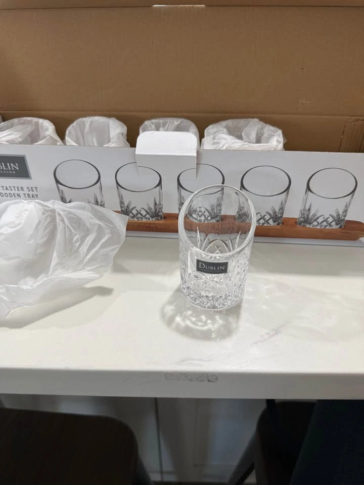 The nespresso view glasses, the nespresso cappuccino shaker kit, Dublin crystal taster set with wooden tray…all brand new never been used in the box.