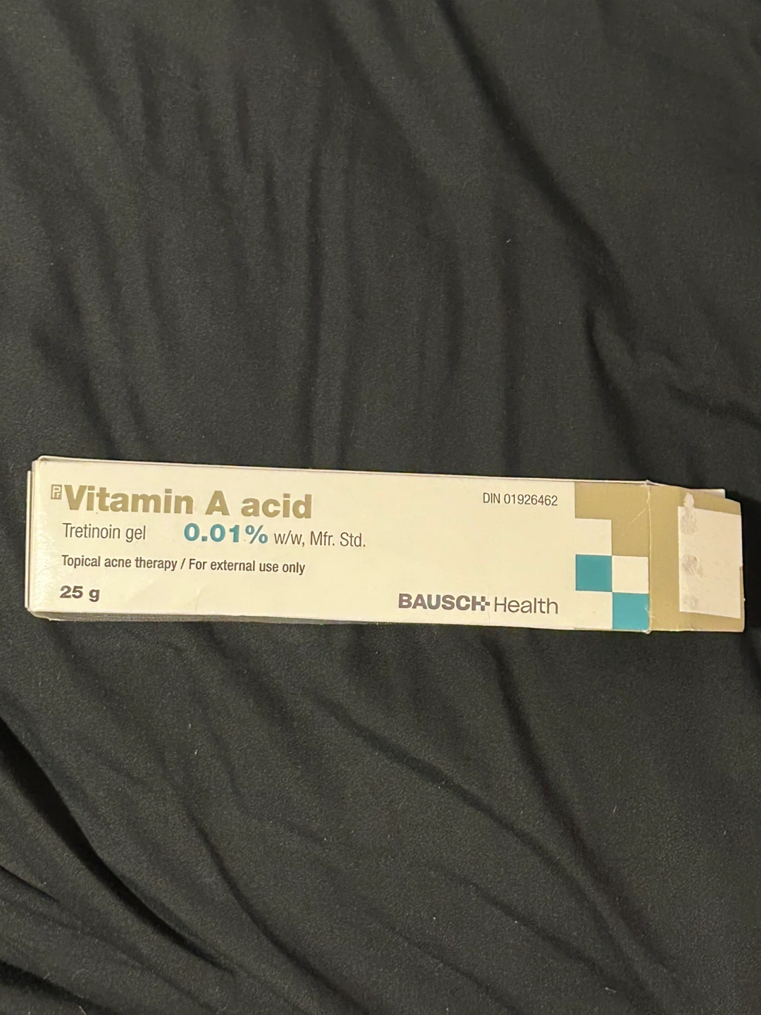 a tube of Bausch Health Vitamin A acid tretinoin gel. It's 0.01% w/w and used for topical acne therapy. The tube contains 25g. #freecycle