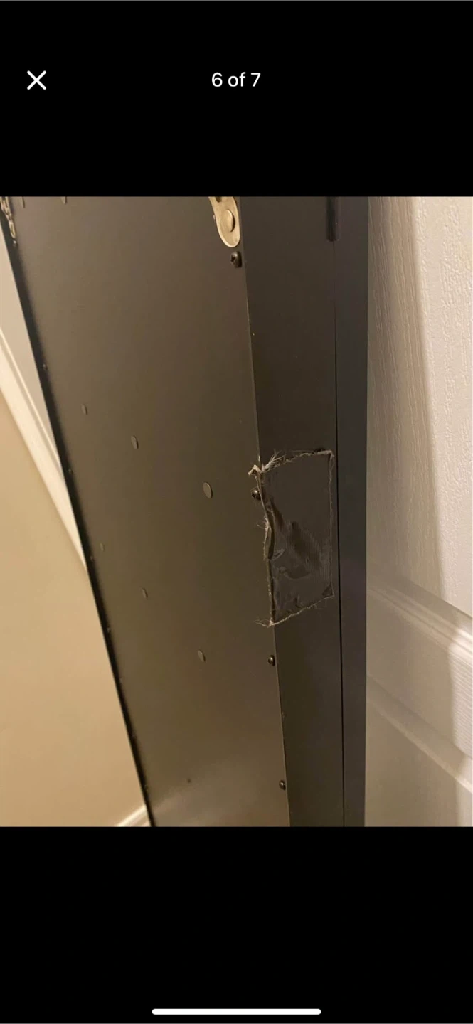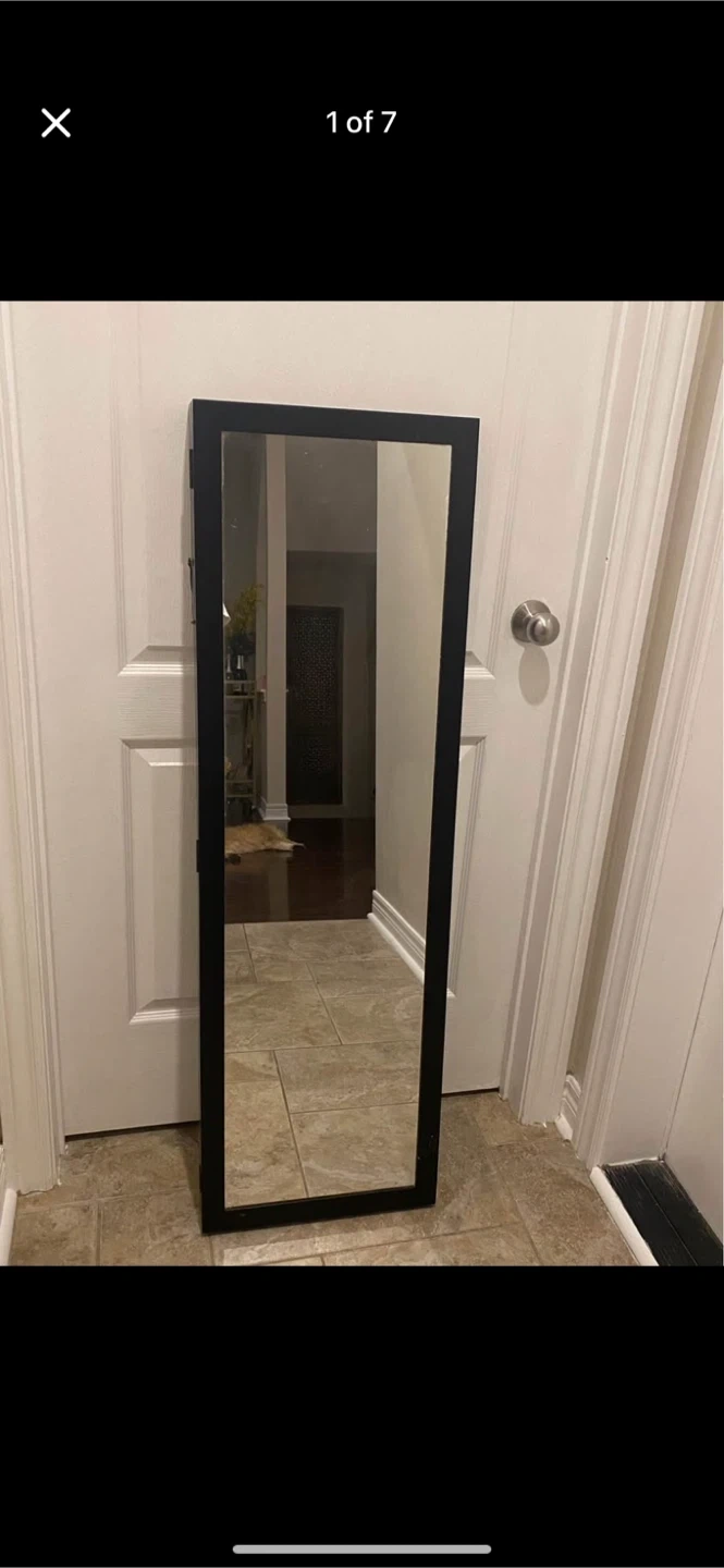 Selling a full length mirror that also doubles as a jewellery storage cabinet! It's black and has some wear and tear, including some scratches and a taped area on the back. Perfect for keeping your accessories organized!