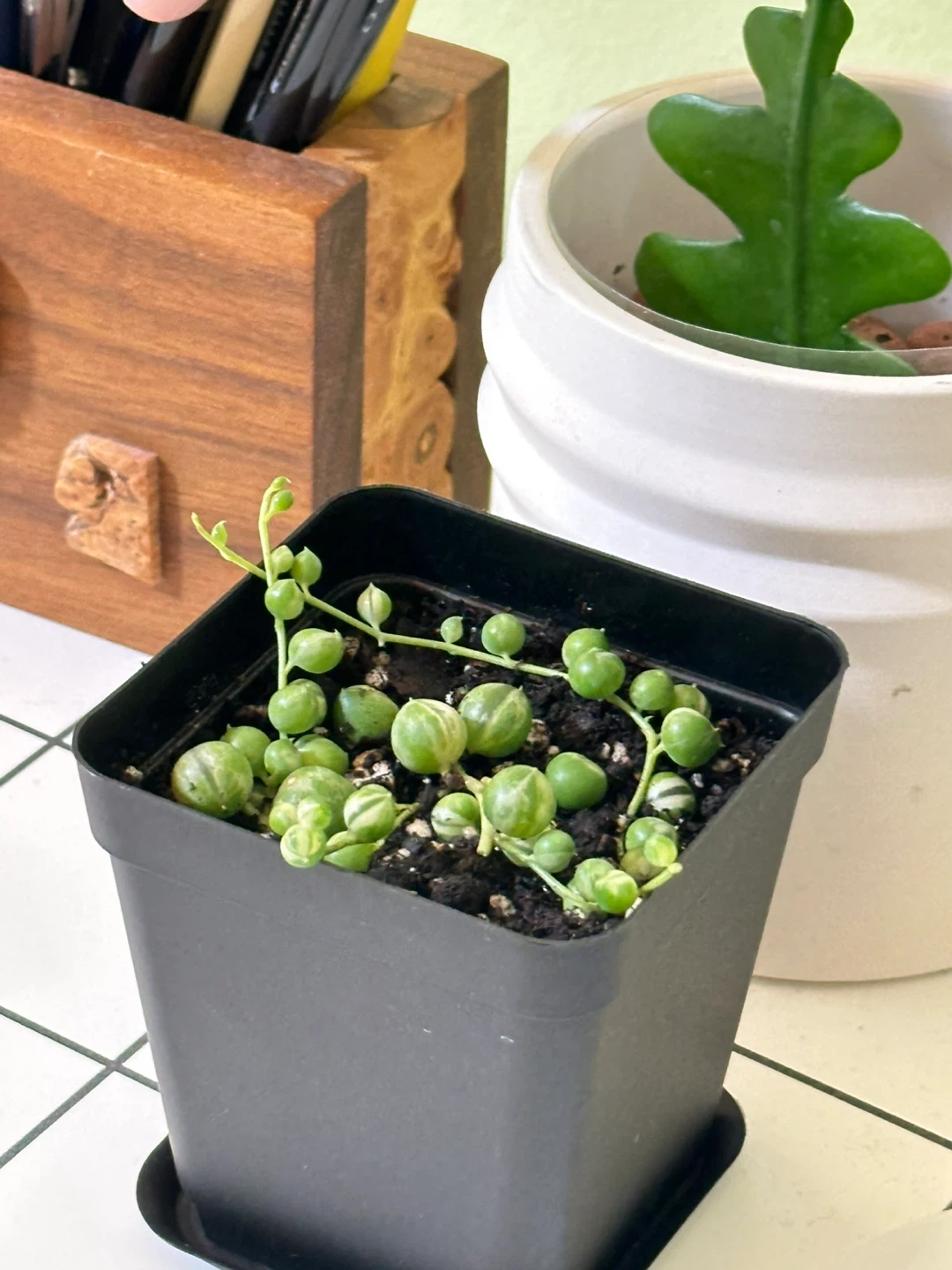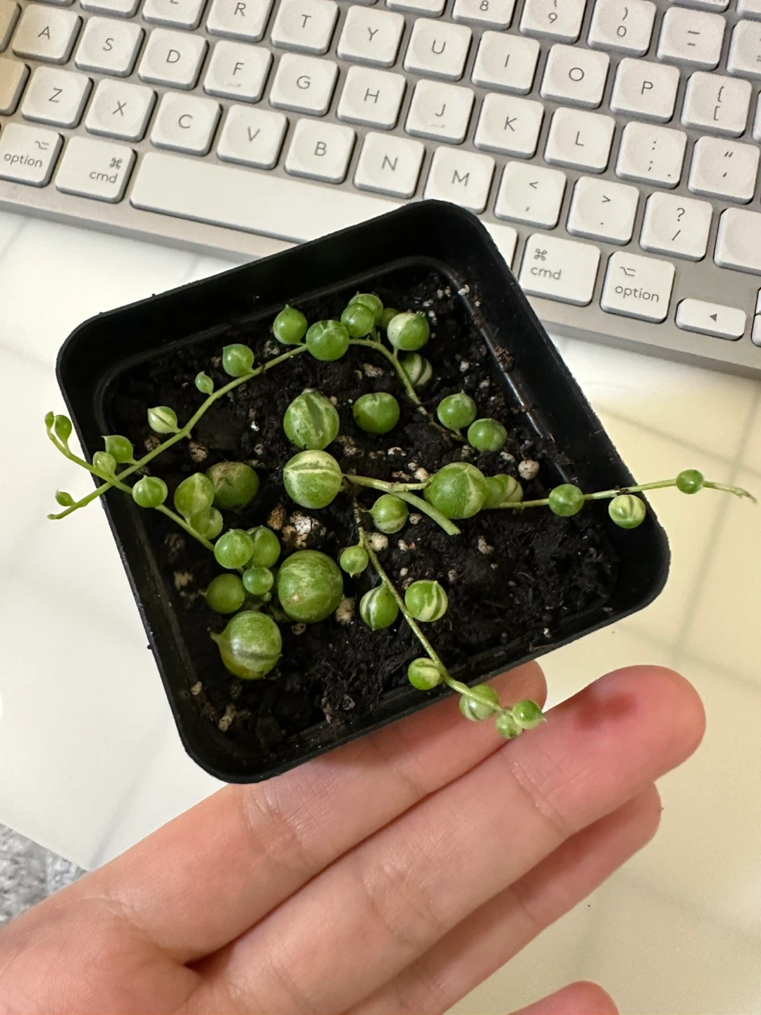 Selling a healthy String of Pearls plant, specifically the Variegata variety. It's currently potted in a black square pot. This plant is known for its unique, pearl-like leaves and trailing growth habit, making it a lovely addition to any indoor space.