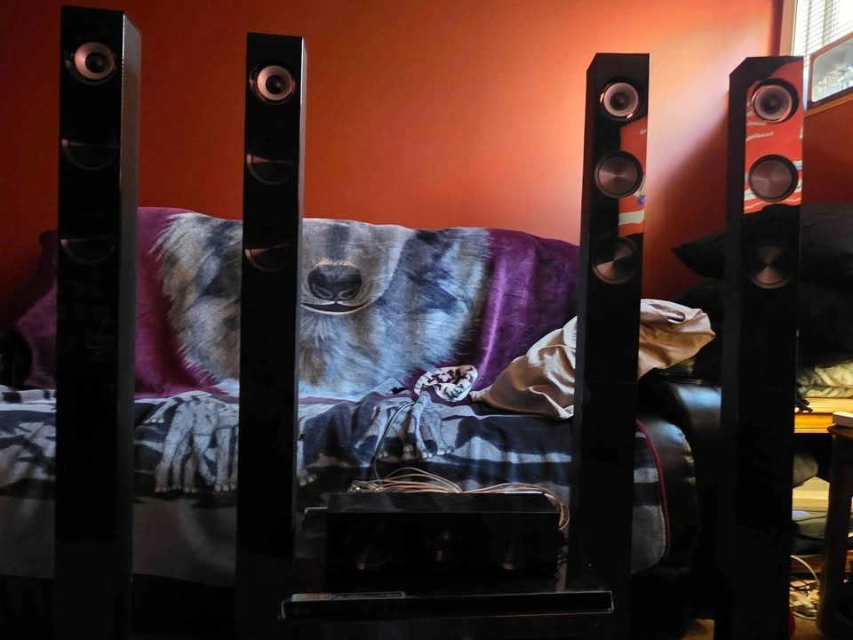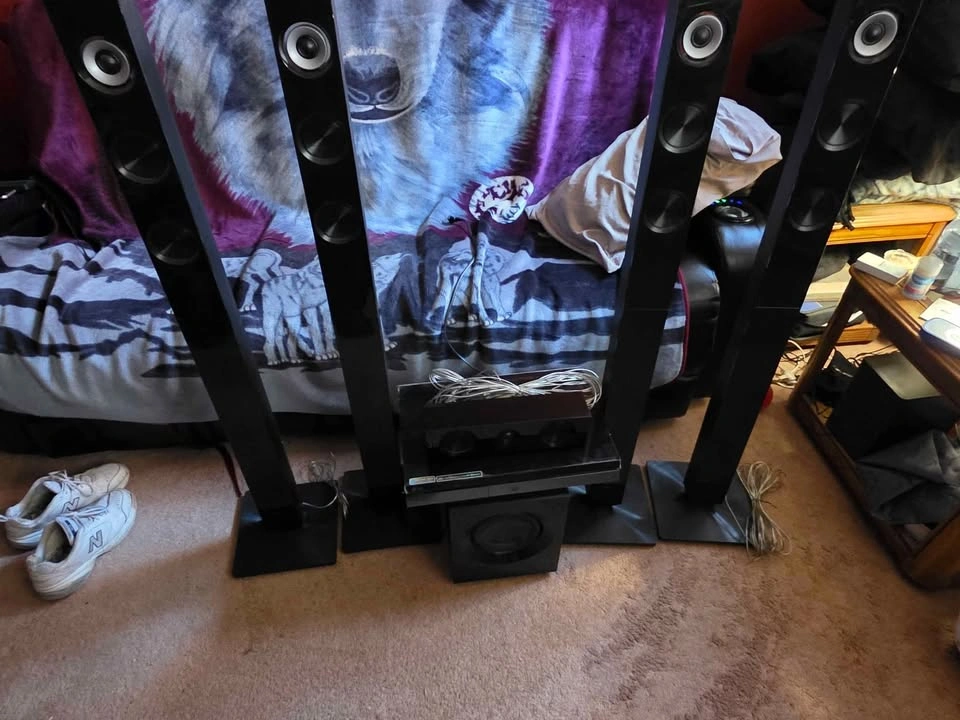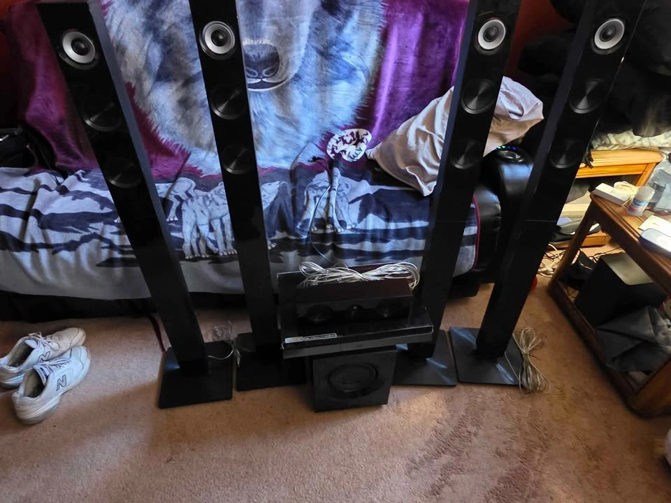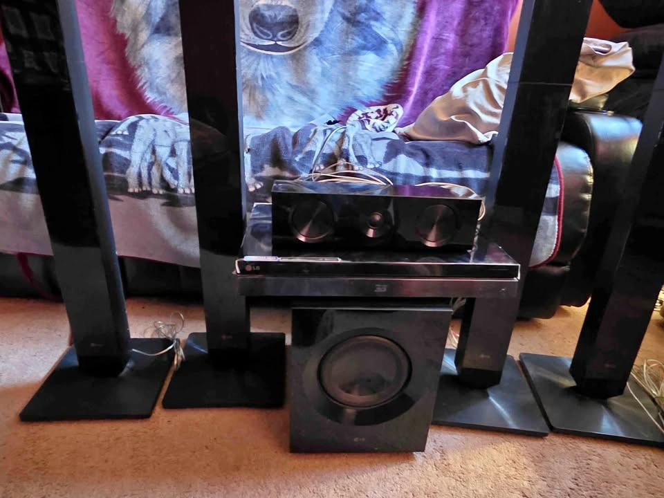 LG Blu-ray home theater system with 5 speakers and a subwoofer. Includes speaker wire and remote. Everything is in working condition, but we've upgraded to a soundbar system and no longer need it. Willing to trade for a working laptop, windows 7 or better. Must pick up.