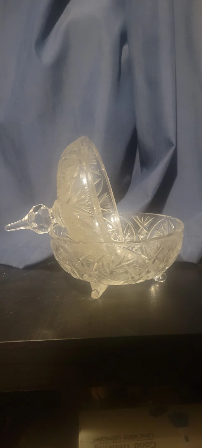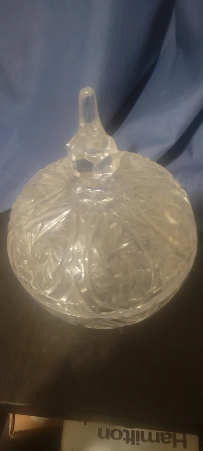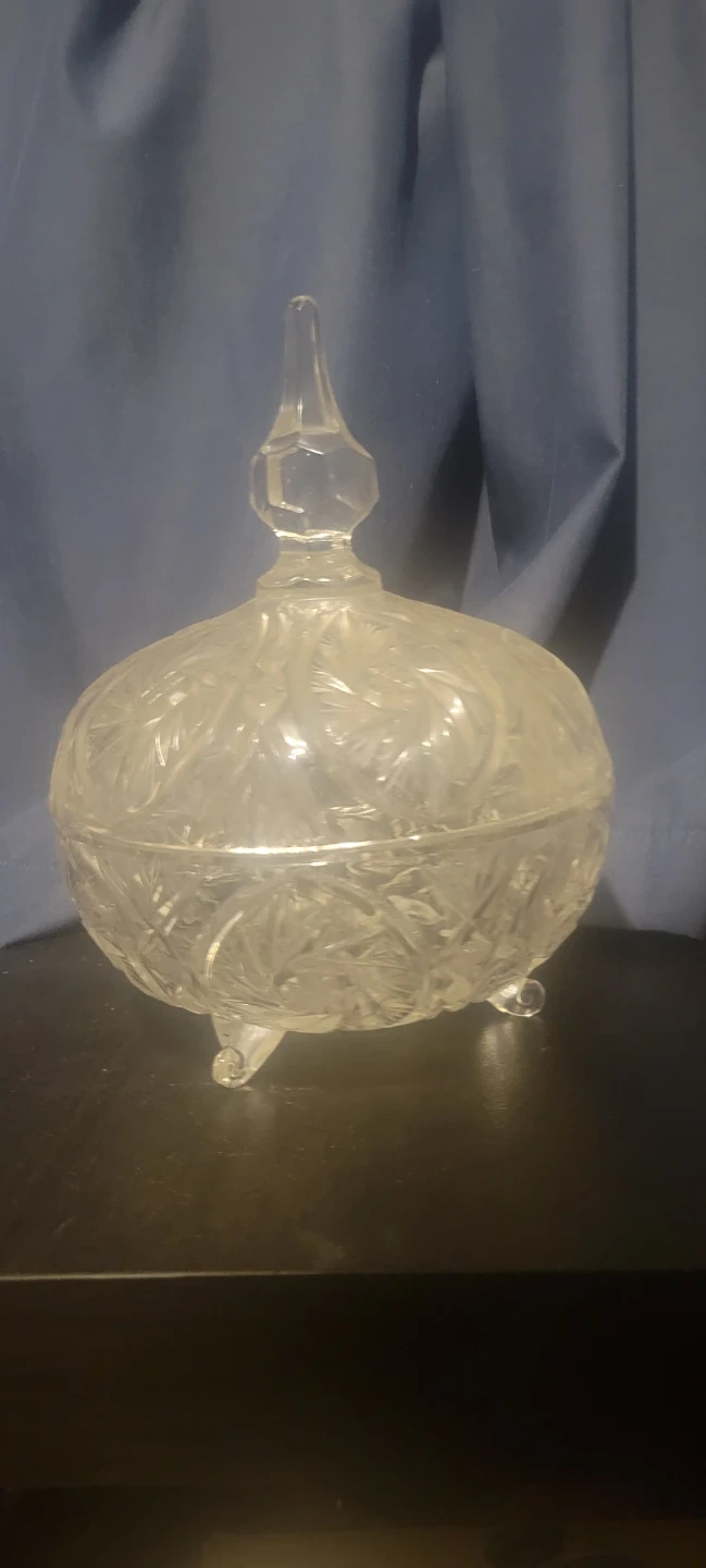 65Here's a lovely vintage crystal trinket/candy dish It comes with a matching lid and features a beautiful starburst pattern. Perfect for storing small items or adding a touch of elegance to your decor