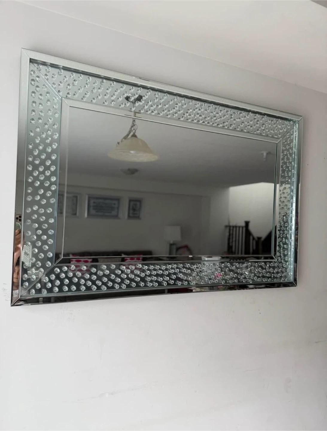 Add a touch of elegance to your home with this beautiful rectangular mirror! The frame is adorned with sparkling beads, giving it a glamorous look. It's in great condition and ready to brighten up any room