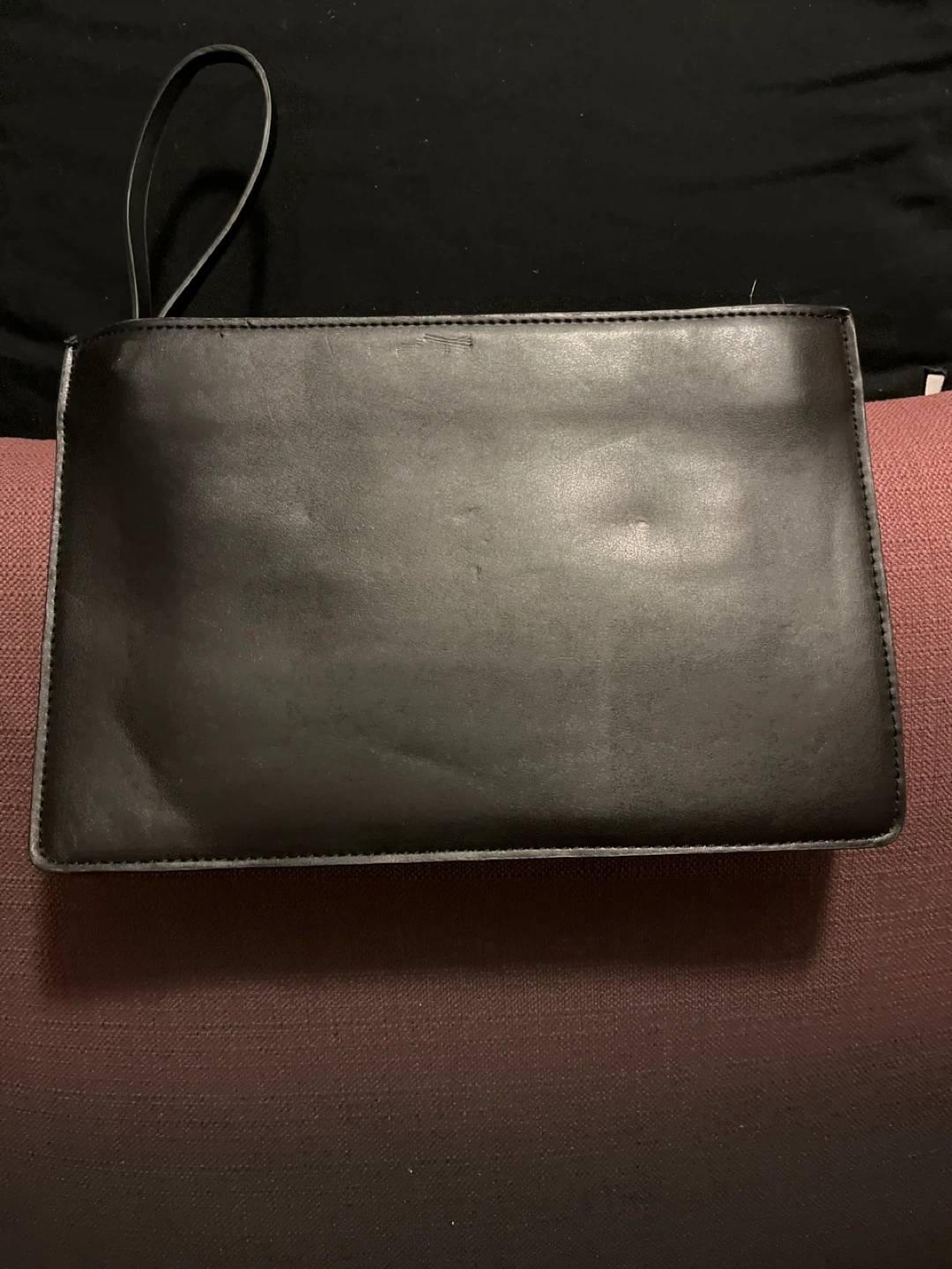 Selling a stylish black leather clutch! It features a unique arrow detail and a convenient wrist strap. Perfect for a night out or keeping your essentials organized