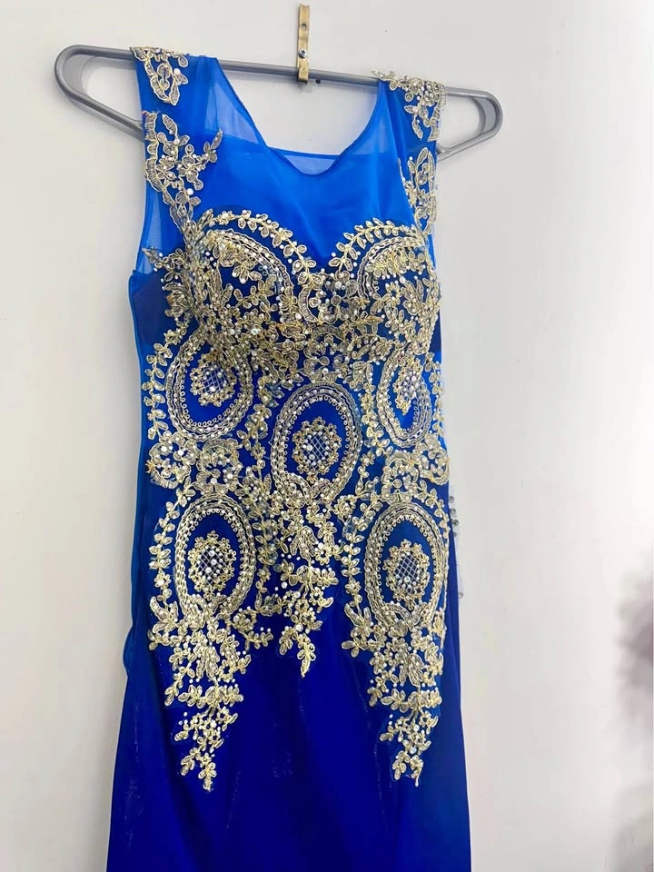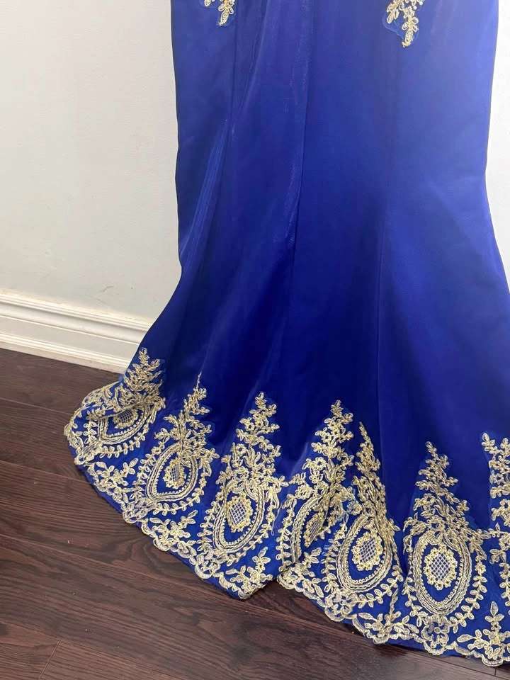 Beautiful, royal blue mermaid cut gown with gold lace details. Perfect for prom or formal events, I bought it for $200+ selling because I wore it once and won’t reach out for it again. Size Small but can be altered up or down