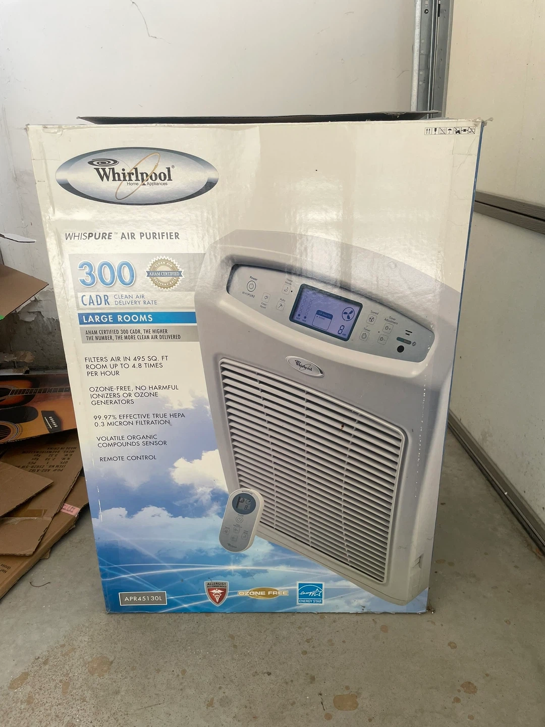 Whirlpool WHISPUREâ„¢ Air Purifier, model APR45130L! It's designed for large rooms and has a CADR of 300. It filters air in a 495 sq ft room up to 4.8 times per hour.