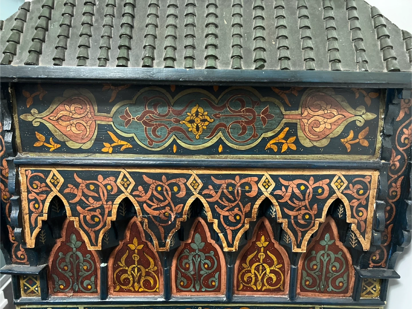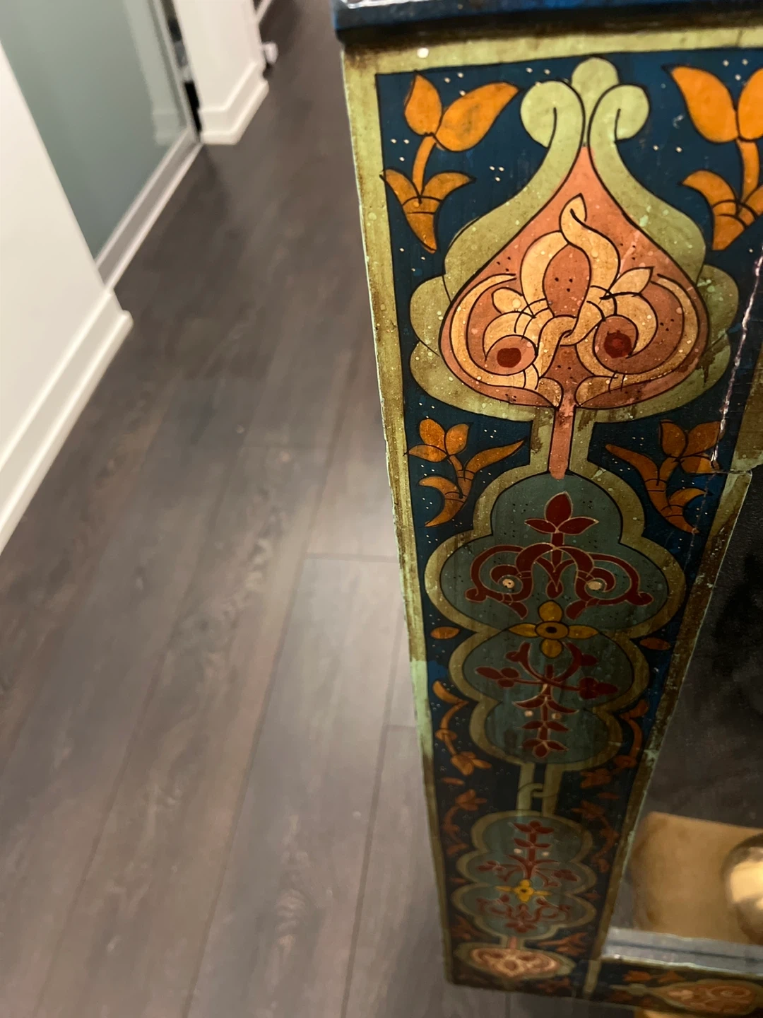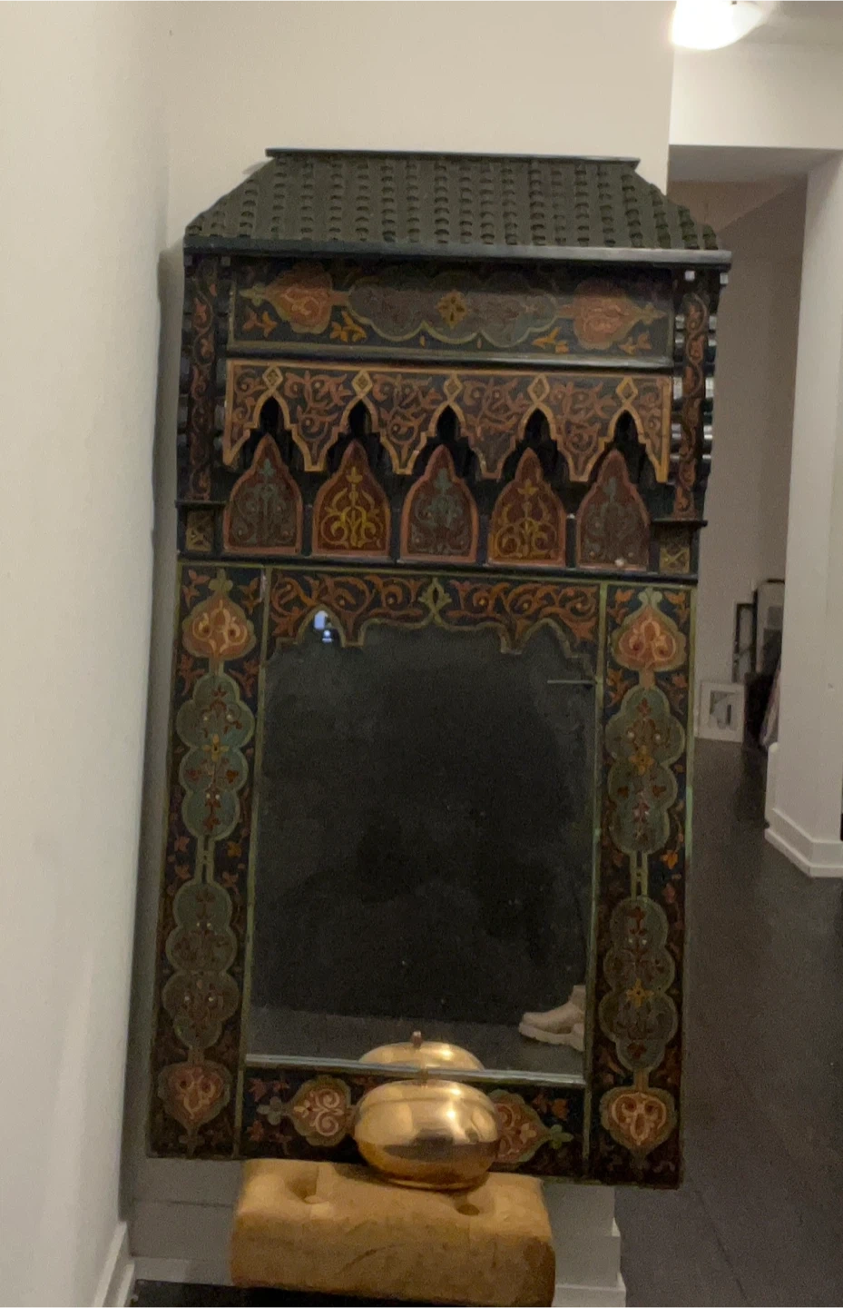 Selling a one-of-a-kind, beautifully detailed mirror featuring intricate hand-painted patterns in rich, warm colors. The design has a distinct Middle Eastern/Moorish influence, with ornate floral and geometric motifs that make it a true statement piece. It’s both functional and artistic — perfect as an accent in an entryway, living room, or dressing area. ✨ Fun fact: I bought this from the set designer for the live-action Aladdin movie! It was one of the pieces selected for the film’s set but ultimately not used, so it became part of her personal collection. Condition: Mostly good. The mirror itself is in fine shape. The wood frame shows some light staining and could use a gentle cleaning, and there are a few small chips consistent with age and use. Dimensions: 55 inches (height) × 28.5 inches (width)