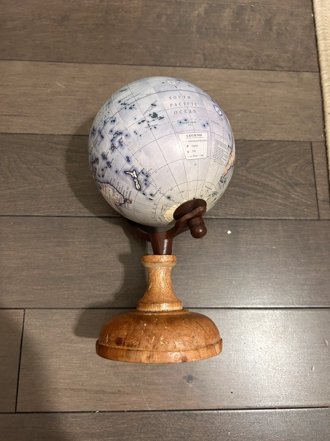 Selling a decorative world globe with a wooden stand. It's in great condition and would look lovely in any room! The globe features countries, cities, and oceans, making it both educational and aesthetically pleasing