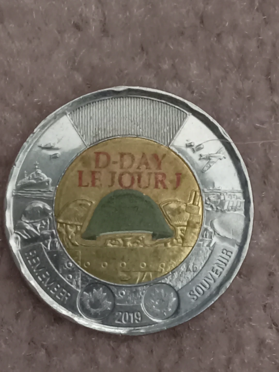 Selling a 2019 coin commemorating D-Day. It says 'D-Day Le Jour' on the front, along with 'Remember Souvenirs. This coin is the colored version.