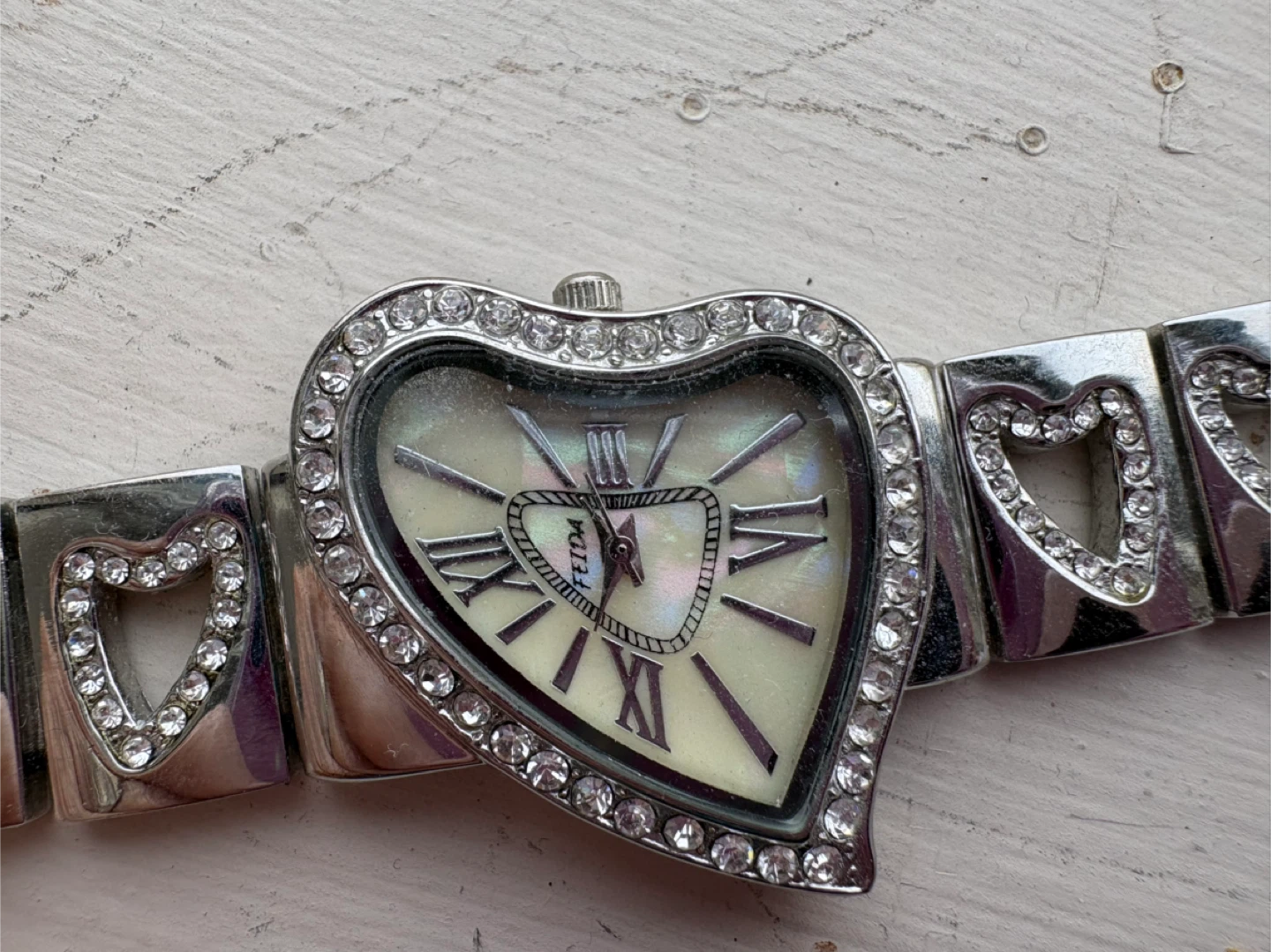 Selling a cute Feida watch with a heart-shaped mother of pearl face and a silver-tone band! The watch face is adorned with sparkling stones, and the band features heart-shaped cutouts. It's a lovely accessory for adding a touch of charm to any outfit
