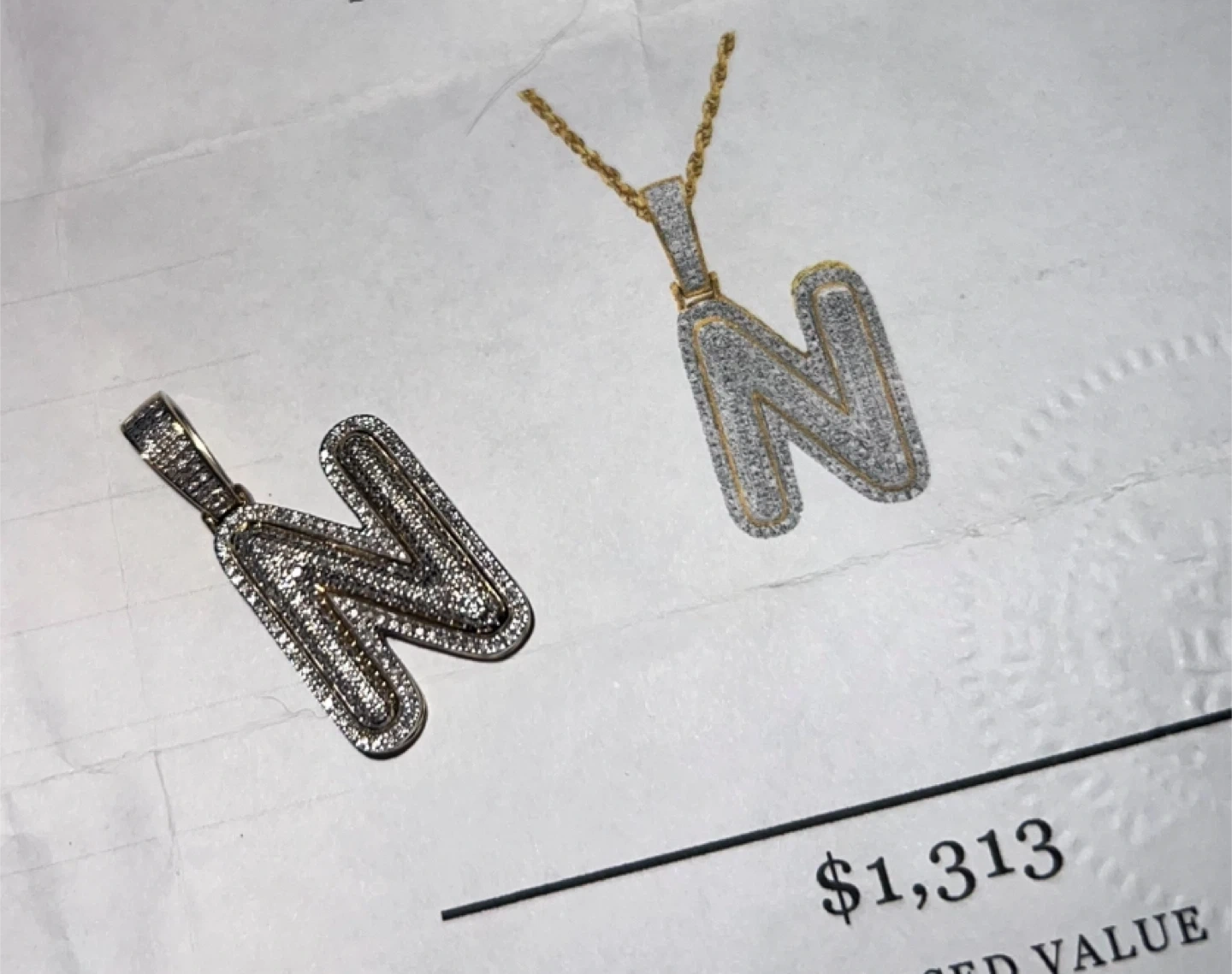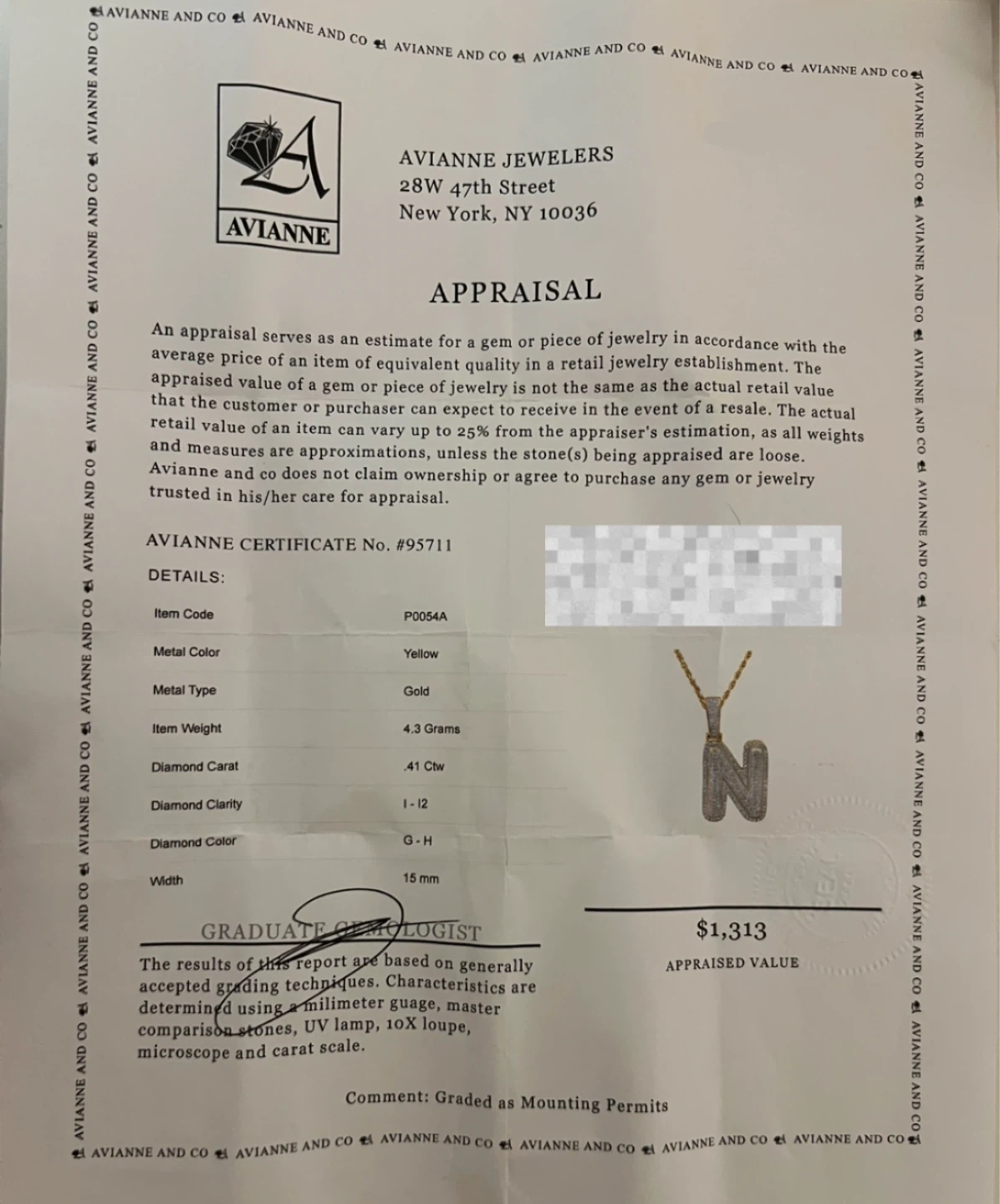 Selling an Avianne Jewelers gold necklace with a letter 'N' pendant. BOX INCLUDED. The appraisal report indicates it's made of gold and weighs 4.3 grams. The diamond clarity is I-12, and the diamond color is G-H. Originally appraised for $1,313 usd,