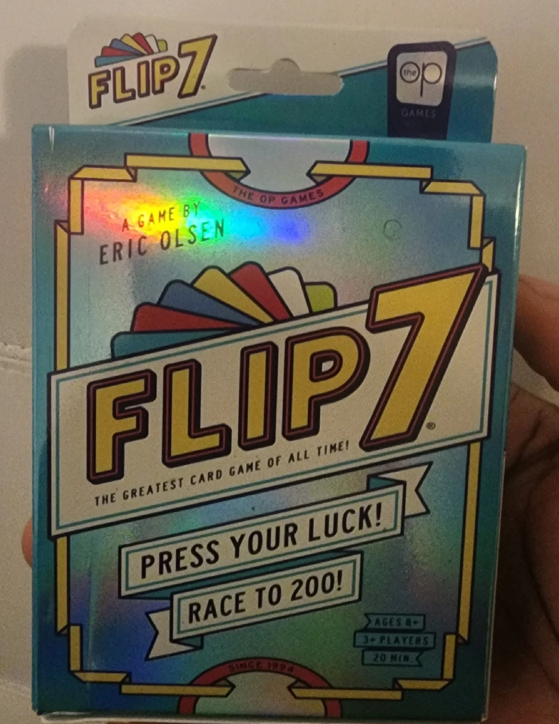 Selling a Flip 7 card game by The Op Games! It's a press your luck style game where you race to 200! Great for ages 8+ and for 3+ players, and games last around 20 minutes
