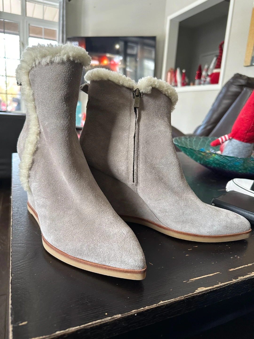 Brand-new Marc Fisher suede wedge ankle boots with cozy shearling trim.