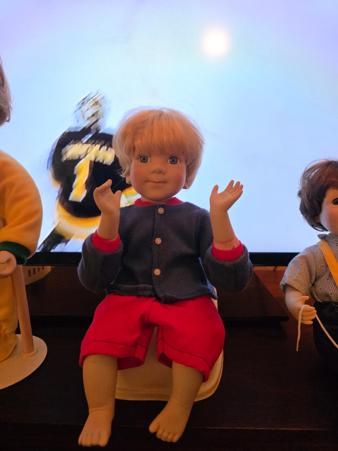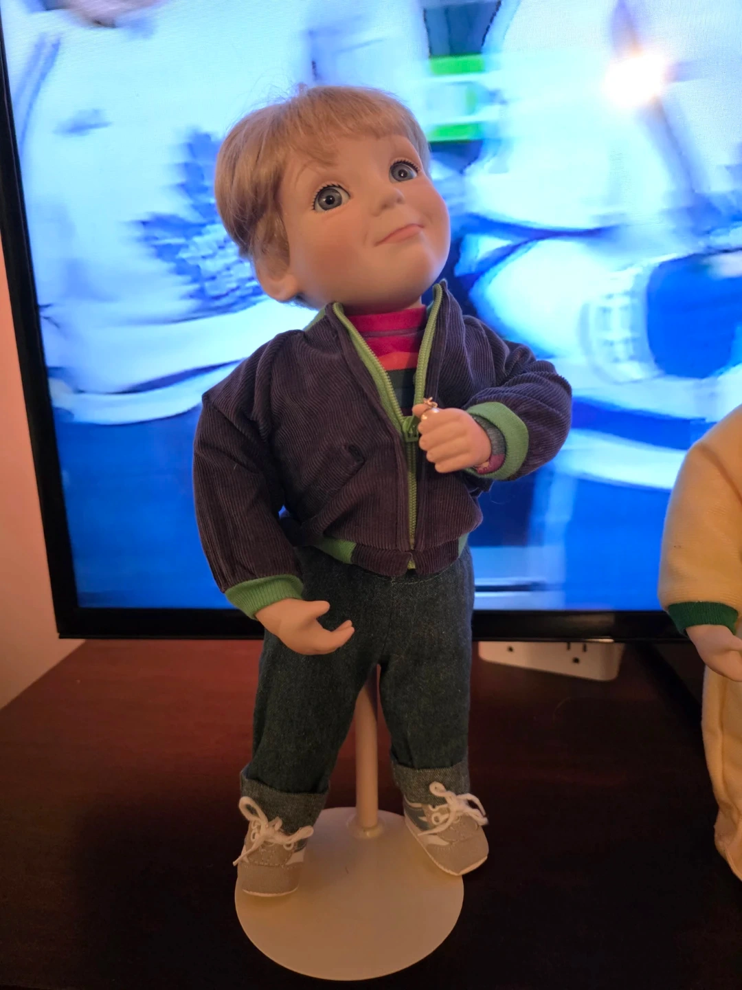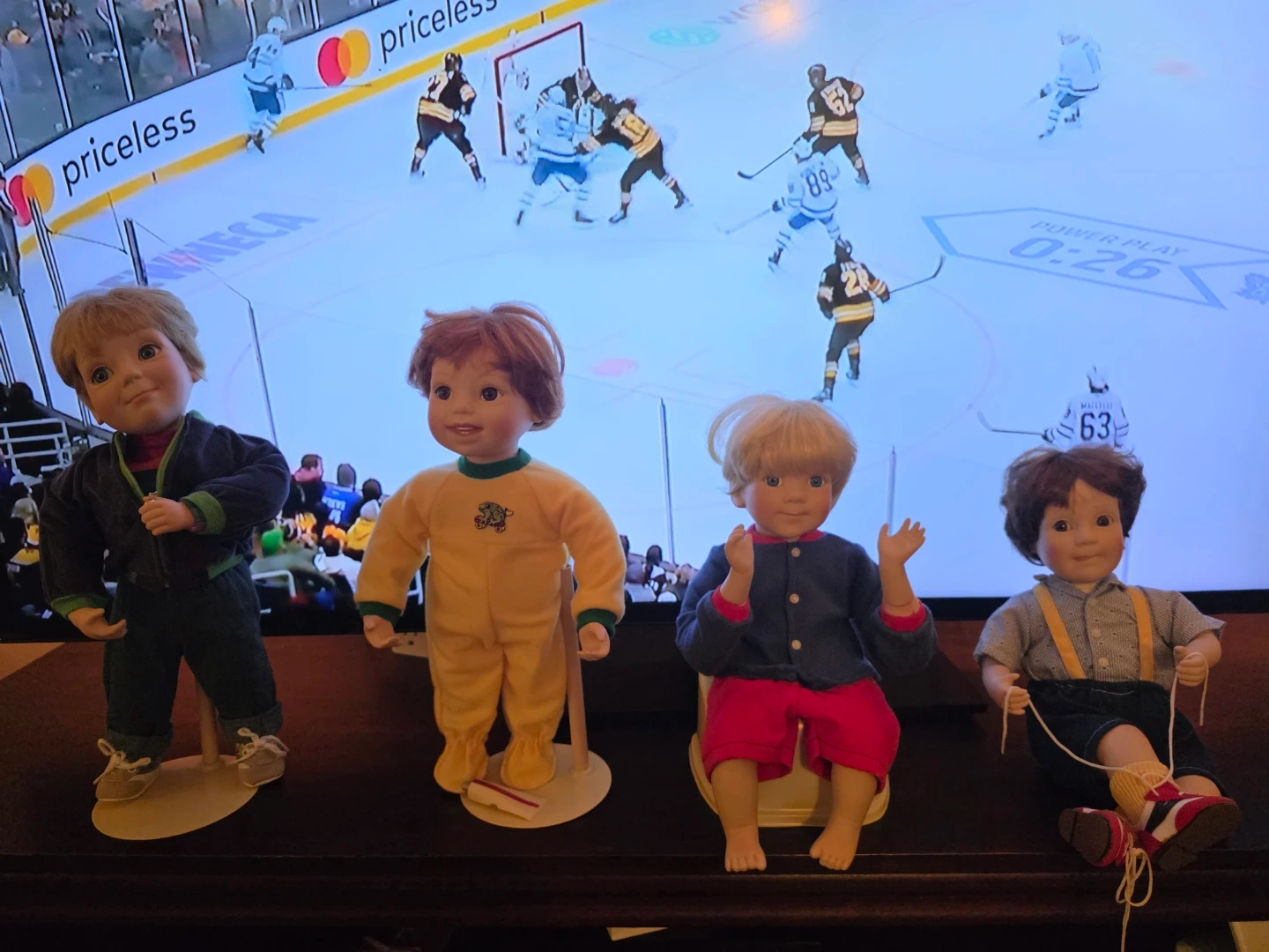 One zipping his jacket, another tying his shoes, one on the potty and one in his pj's