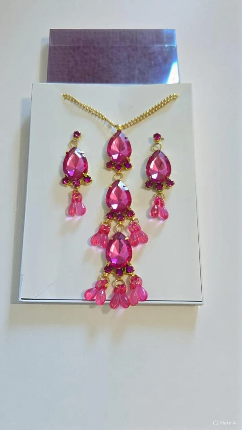 This is a beautiful matching necklace and earring set. The set features pink gemstones and gold-tone accents. The necklace has a cascading design, and the earrings are drop style. Perfect for adding a pop of colour to any outfit!