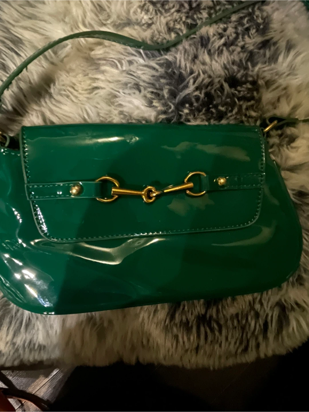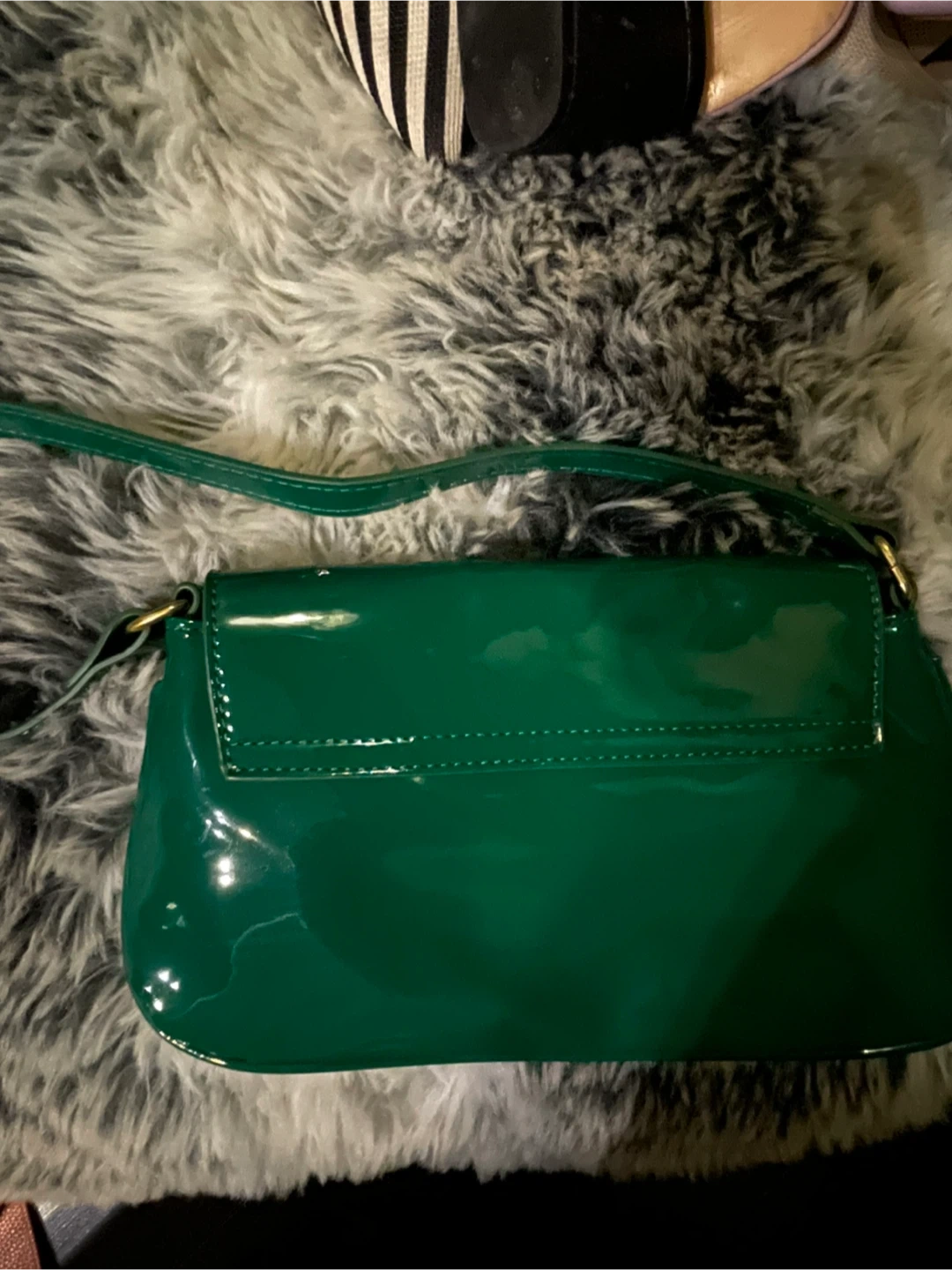 Here's a lovely green patent leather shoulder bag! It's in great condition and would be a stylish addition to any outfit