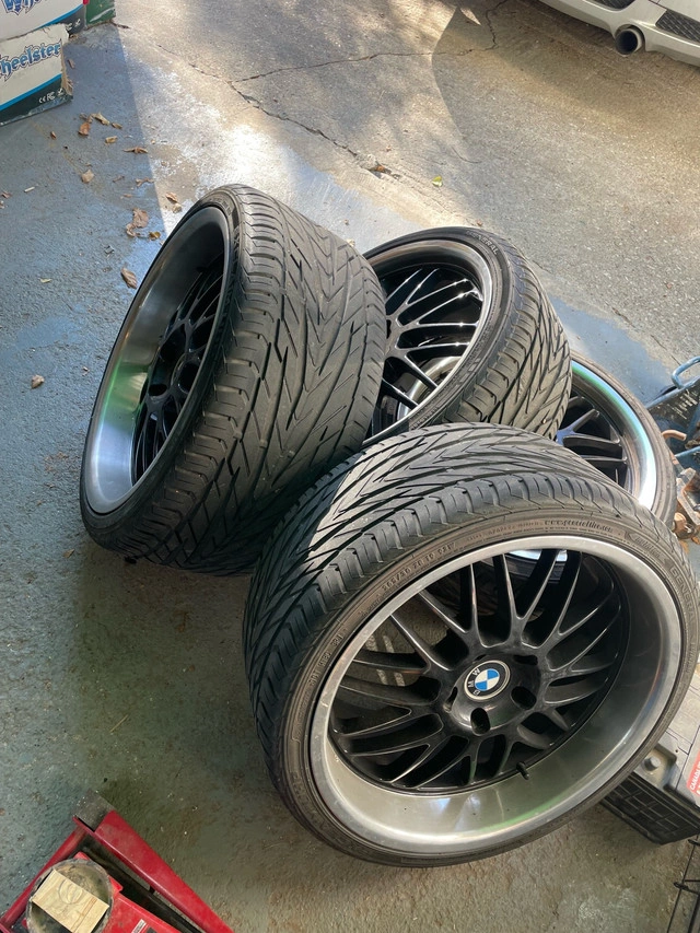 I am selling a set of four 19-inch rims with tires. The rims are in good condition as you can see from the photos, with the exception of one rash on the rear left rim. They are the perfect blend of style and performance for your vehicle. * Rim / Tire Size F: 19x8.5 ET15 235/35 ZR 19 R: 19x9.5 ET25 265/30 ZR 19 B: 5x120 * Tire Size: * Brand: BMW 335I These rims and tires are looking for a new home. If you're seeing this ad, yes, they're still available! Don't miss out!