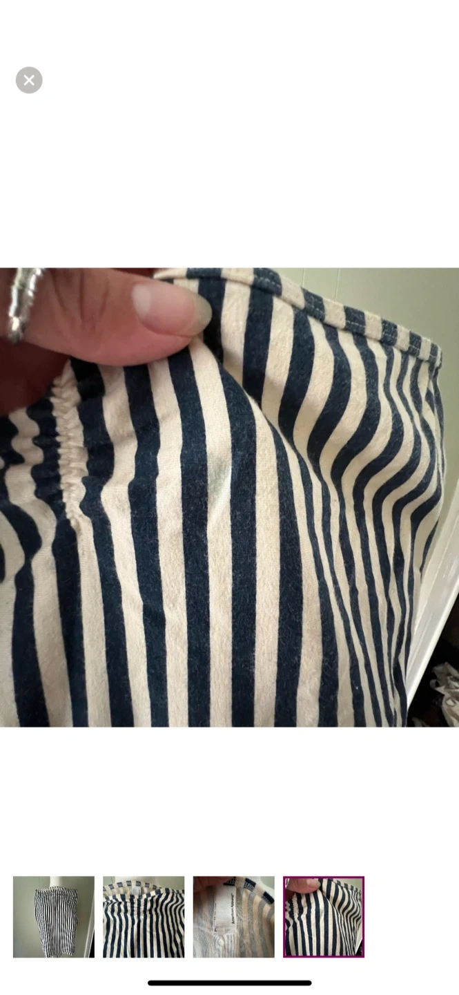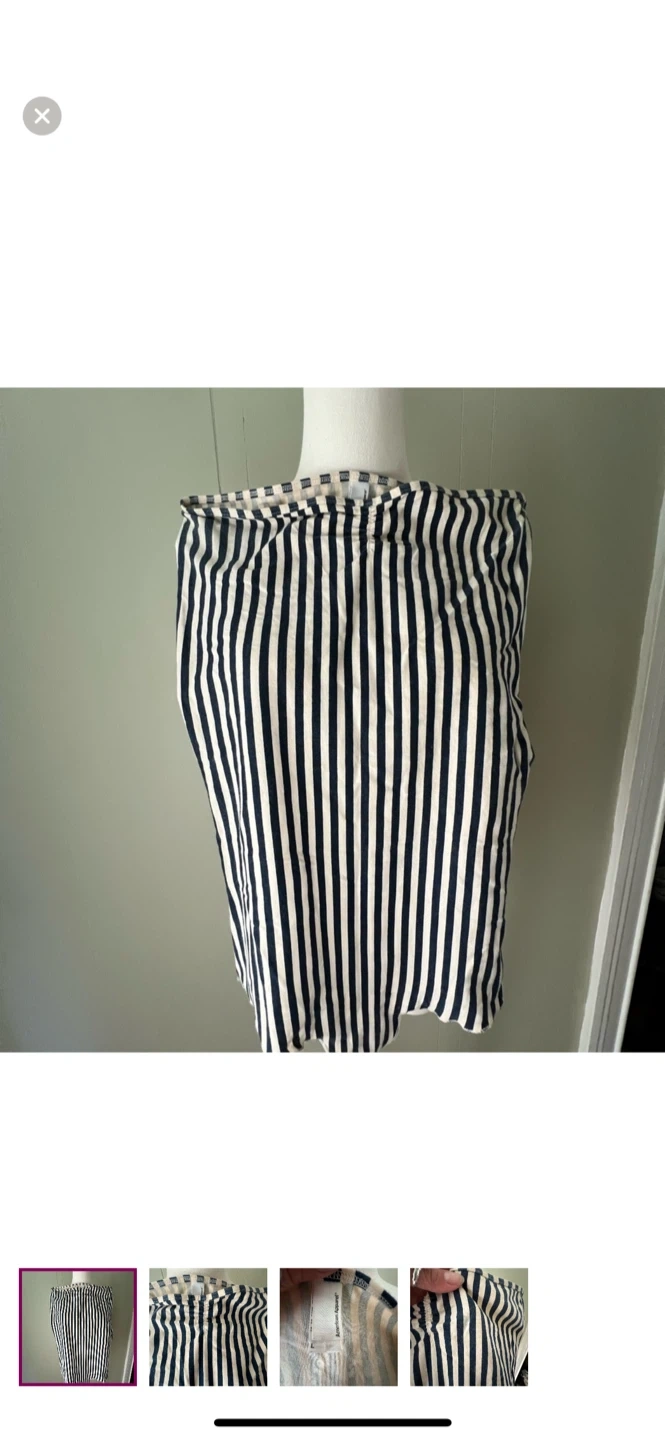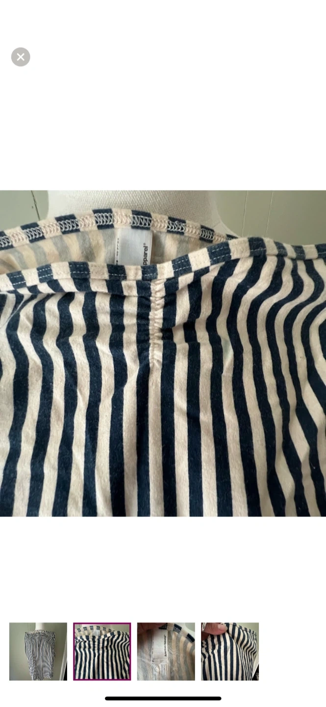 Selling an American Apparel striped body suit in size L. It features a classic striped pattern. There is a small stain near the top of the dress. Please see photos for details!