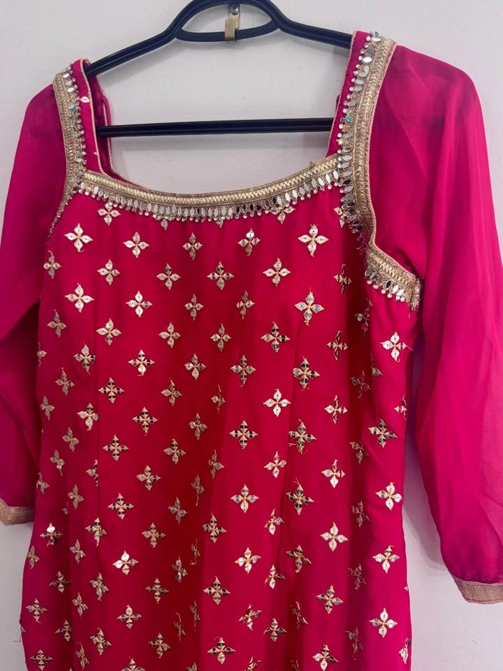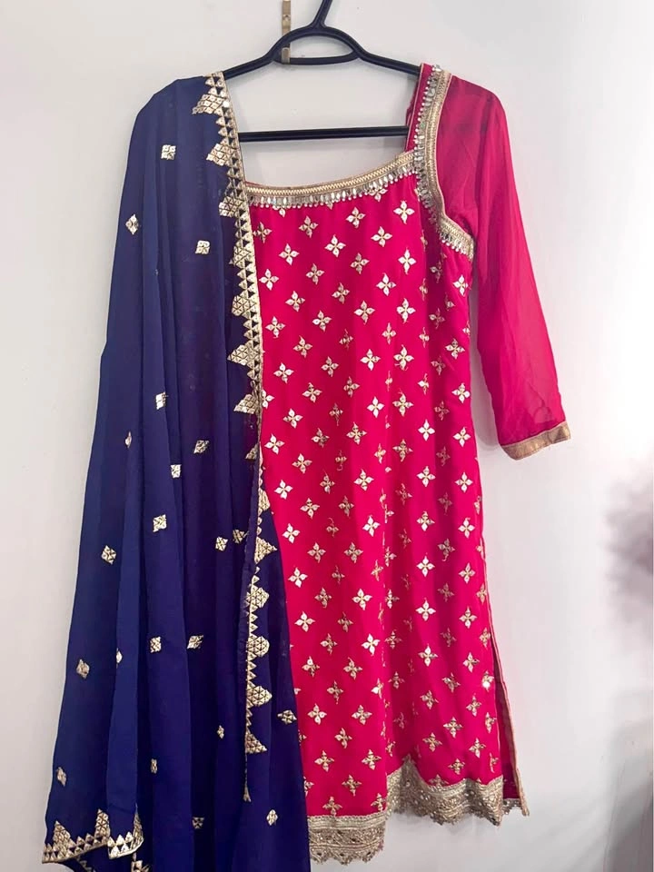 Rani pink and navy blue shara suit with champagne toned mirror work and embroidery, perfect for mehendi functions and indian-pakistani wedding events/ parties
