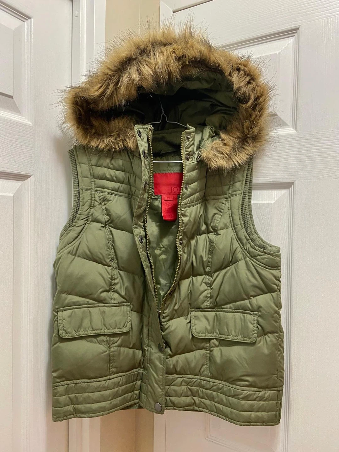 170Here's a Joe Fresh puffer vest in olive green. It has a detachable faux fur-trimmed hood and is a size L. Great for layering!
