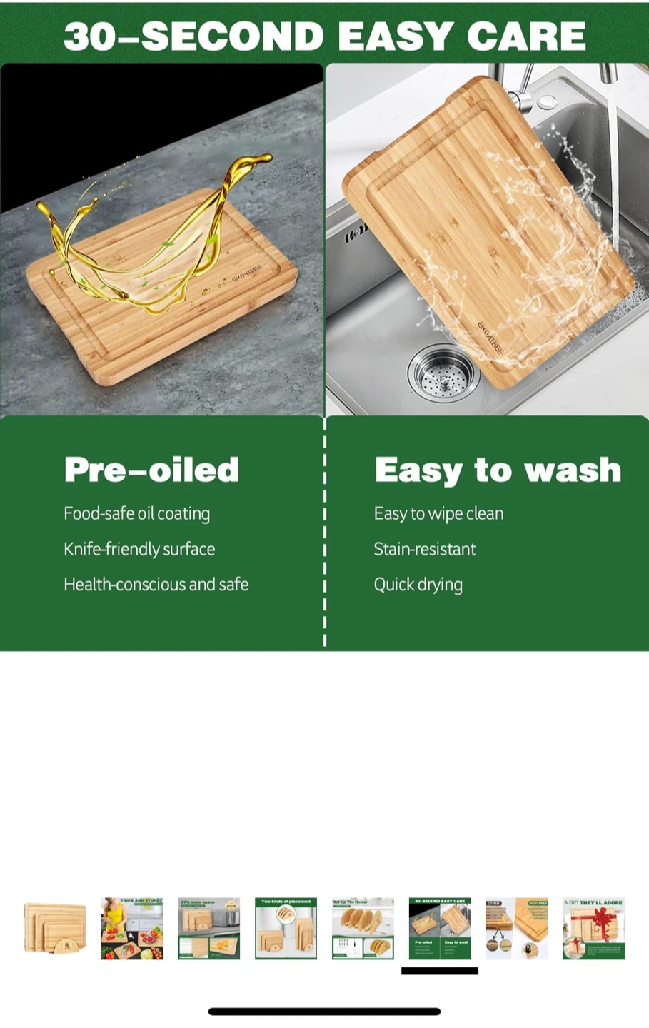 I'm selling a brand new Skovtree bamboo cutting board set! It includes multiple sizes to suit all your chopping needs. The boards have a juice groove to keep your counters clean, and built-in handles for easy carrying. They are pre-oiled and easy to wash too!