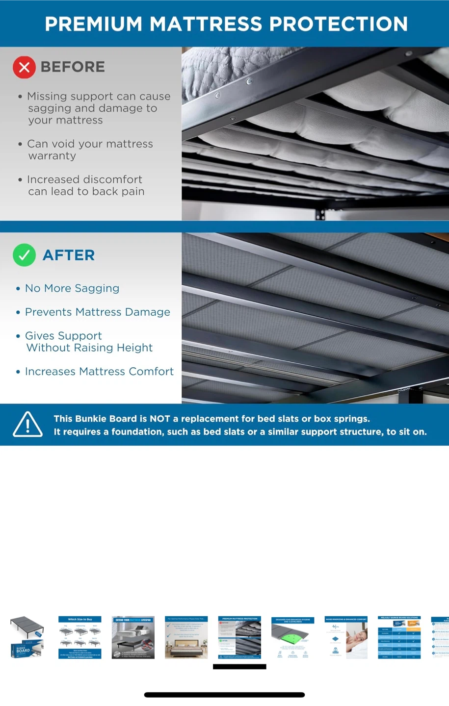 Important note: This bunkie board is not a replacement for bed slats or box springs, and requires a foundation to sit on. The bed slats should not be farther apart than 8 inches.
