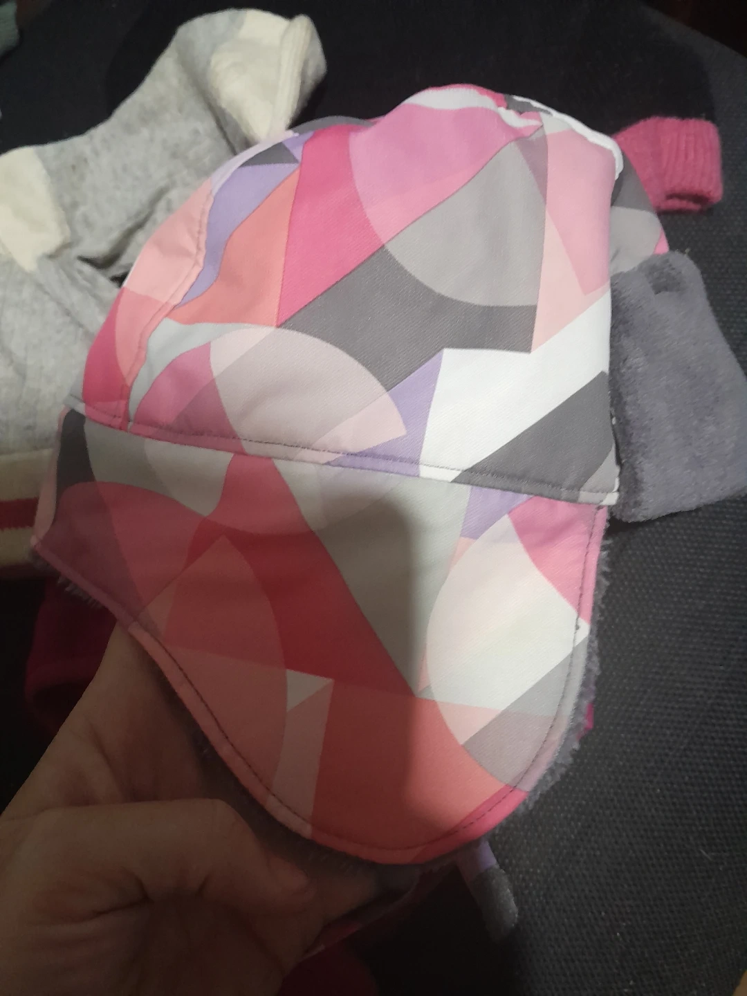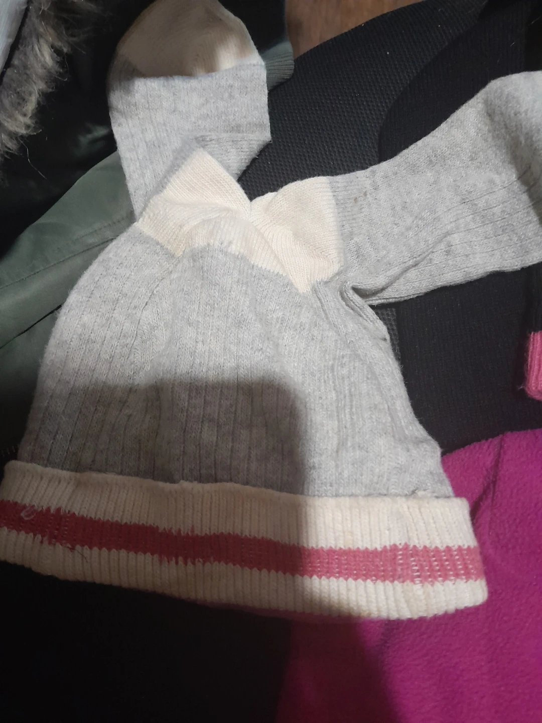 Selling a variety of kids hats! There's a grey knit hat with a bow, a pink OshKosh fleece hat, and a pink patterned hat with ear flaps. Perfect for keeping your little one warm!
