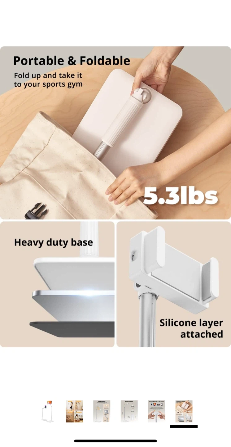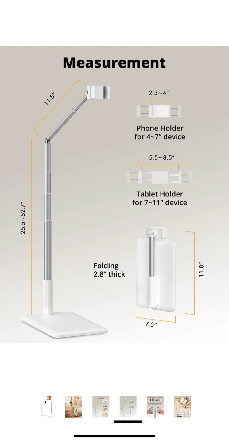 Get the perfect viewing angle with this adjustable floor stand! It's compatible with devices from 4 to 11 inches, so it works for both phones and tablets. The stand features a three-section retractable pole and can rotate 360 degrees for maximum flexibility. It's also foldable, making it easy to store when not in use. The height is adjustable from 25.5" to 52.7".