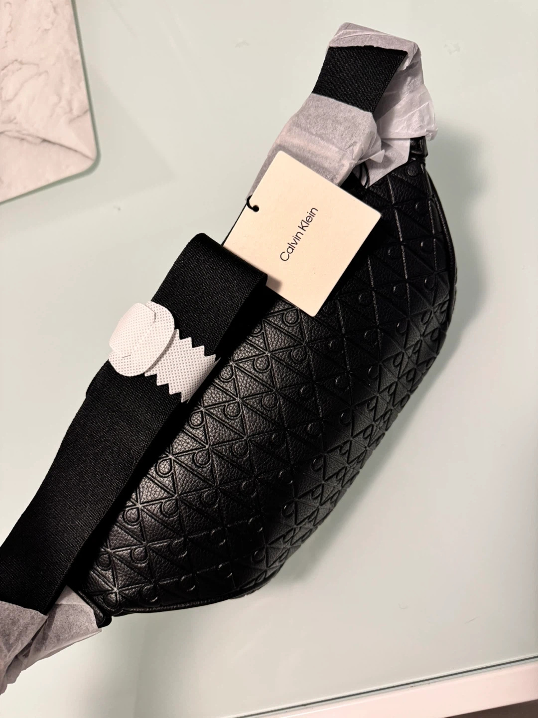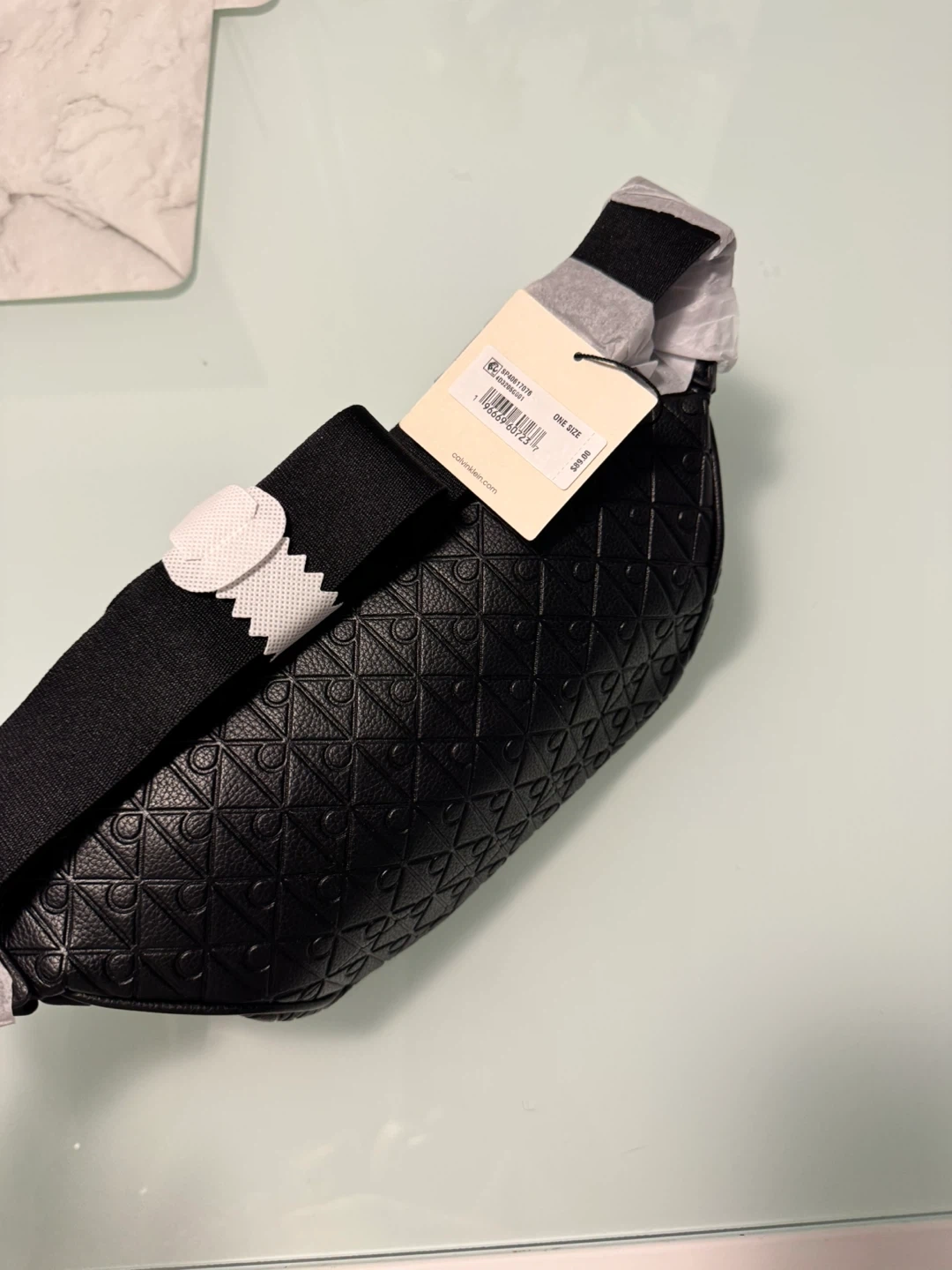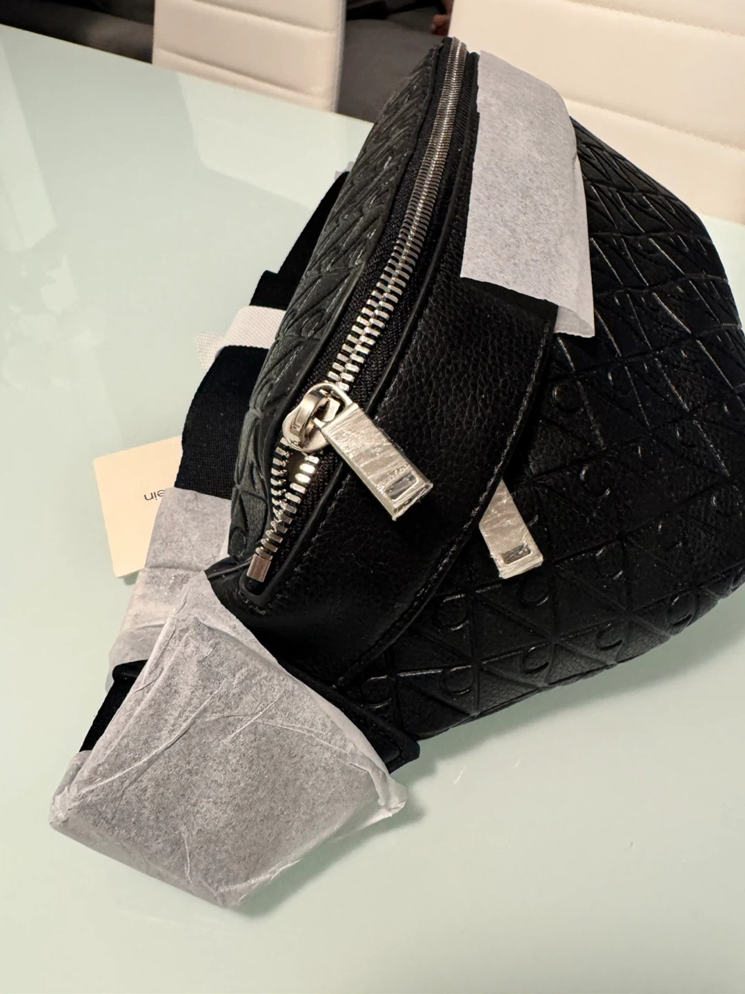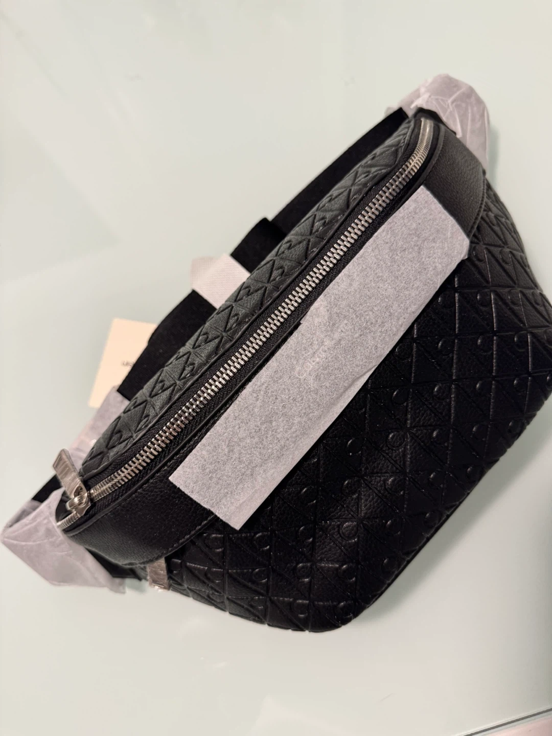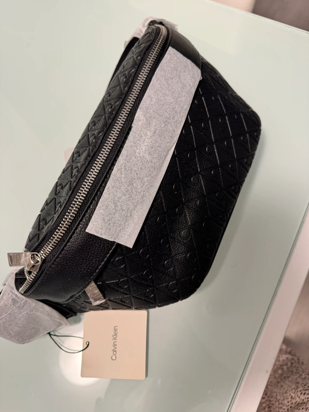 This is a black Calvin Klein belt bag with an all-over embossed pattern. It features a zippered main compartment and an adjustable strap. The bag is made of faux leather. Brand new. No use.