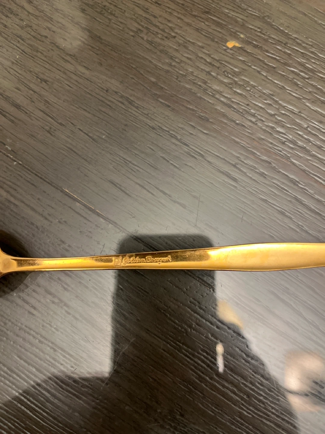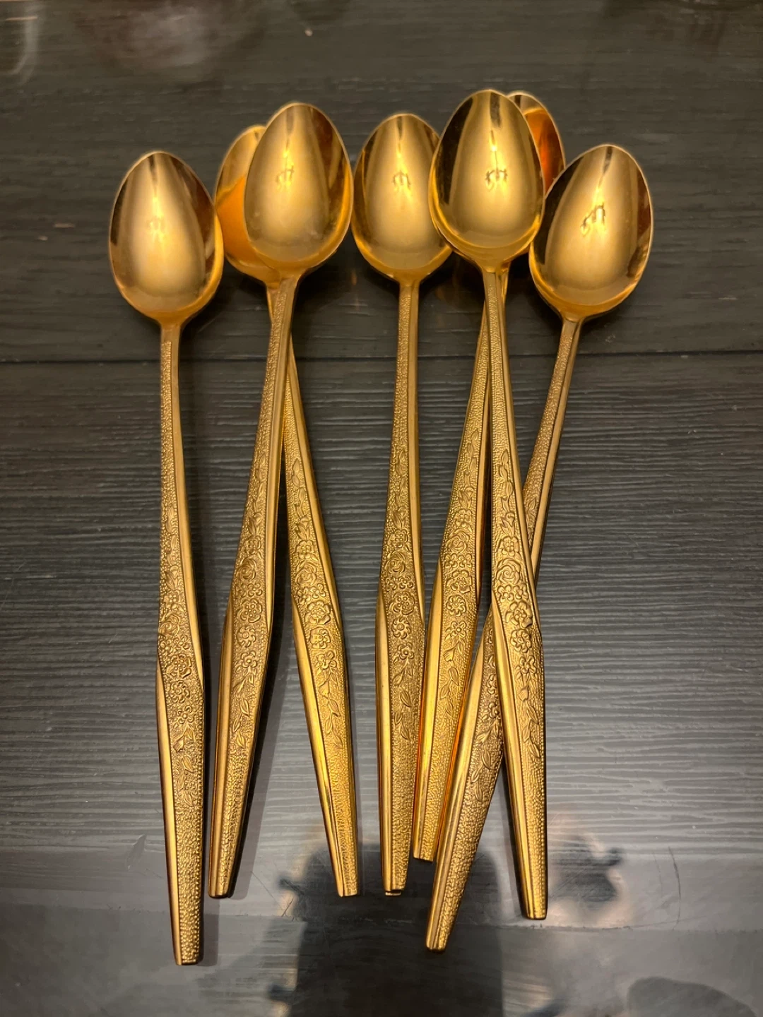 Selling a set of 7 gold-plated teaspoons from Golden Bouquet! These have a lovely floral design on the handles and would be a beautiful addition to any tea set