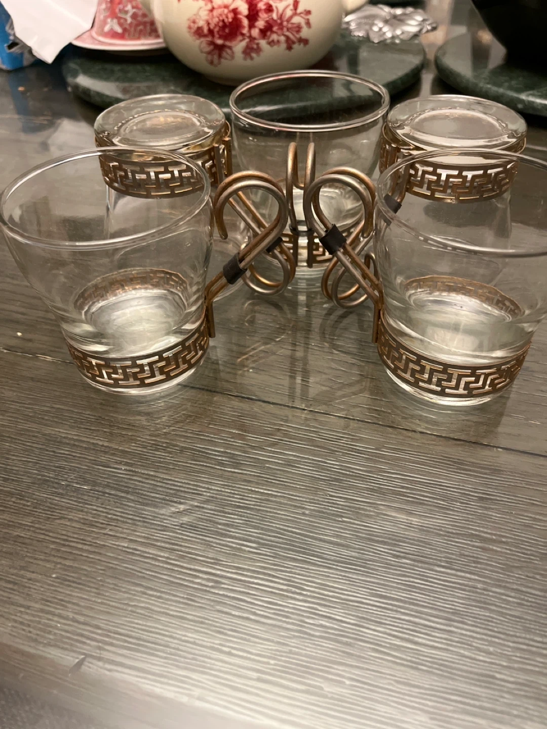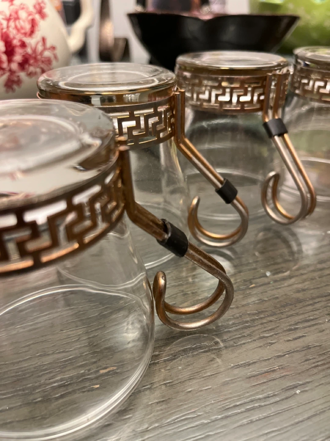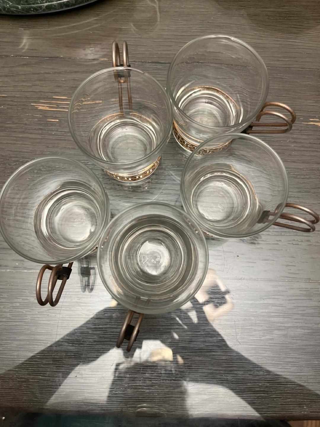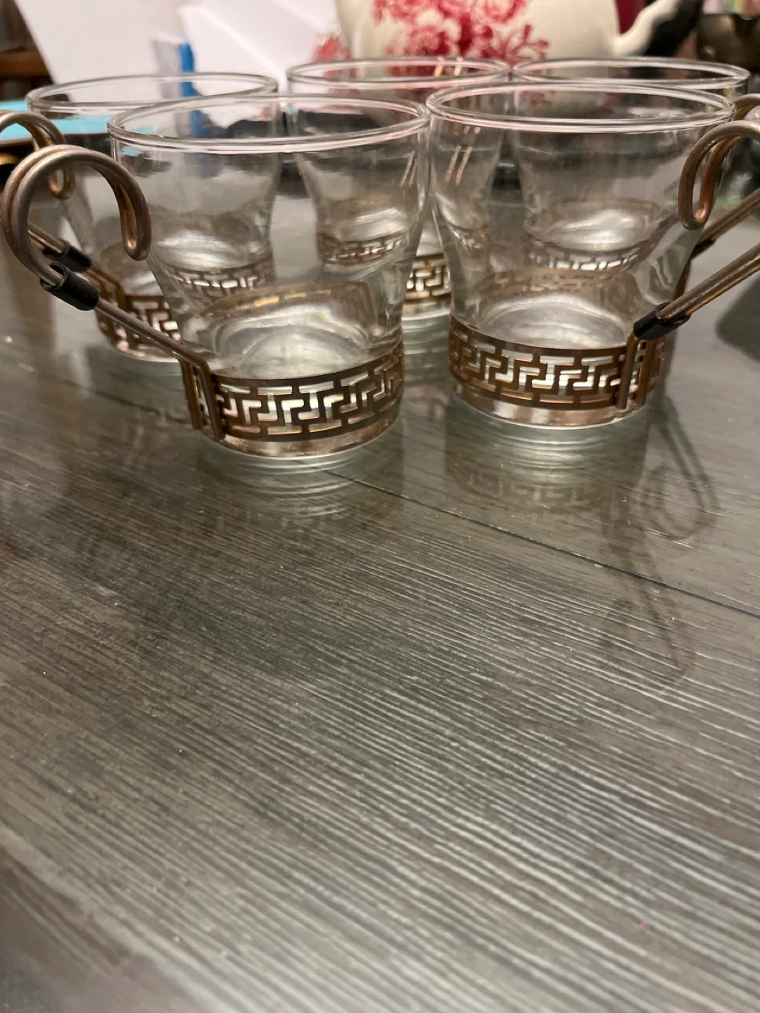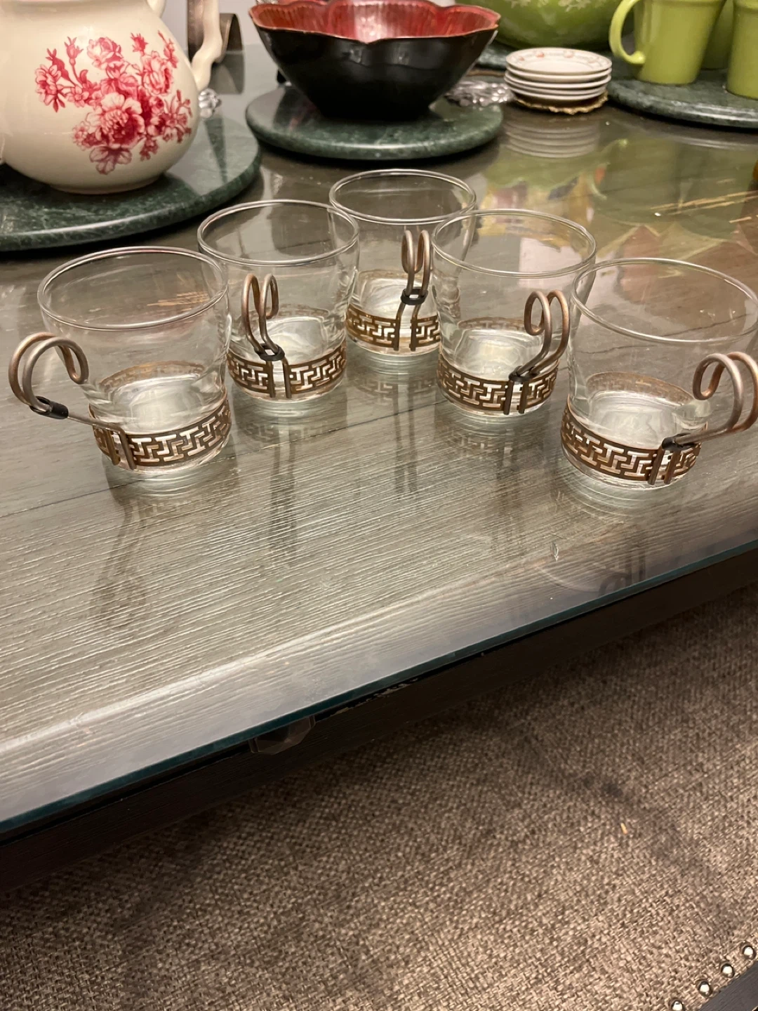 Selling a set of five glass tea cups, each with a unique metal handle design. These cups are perfect for enjoying your favorite hot beverages and adding a touch of elegance to your tea time. They are in great condition and ready for a new home!