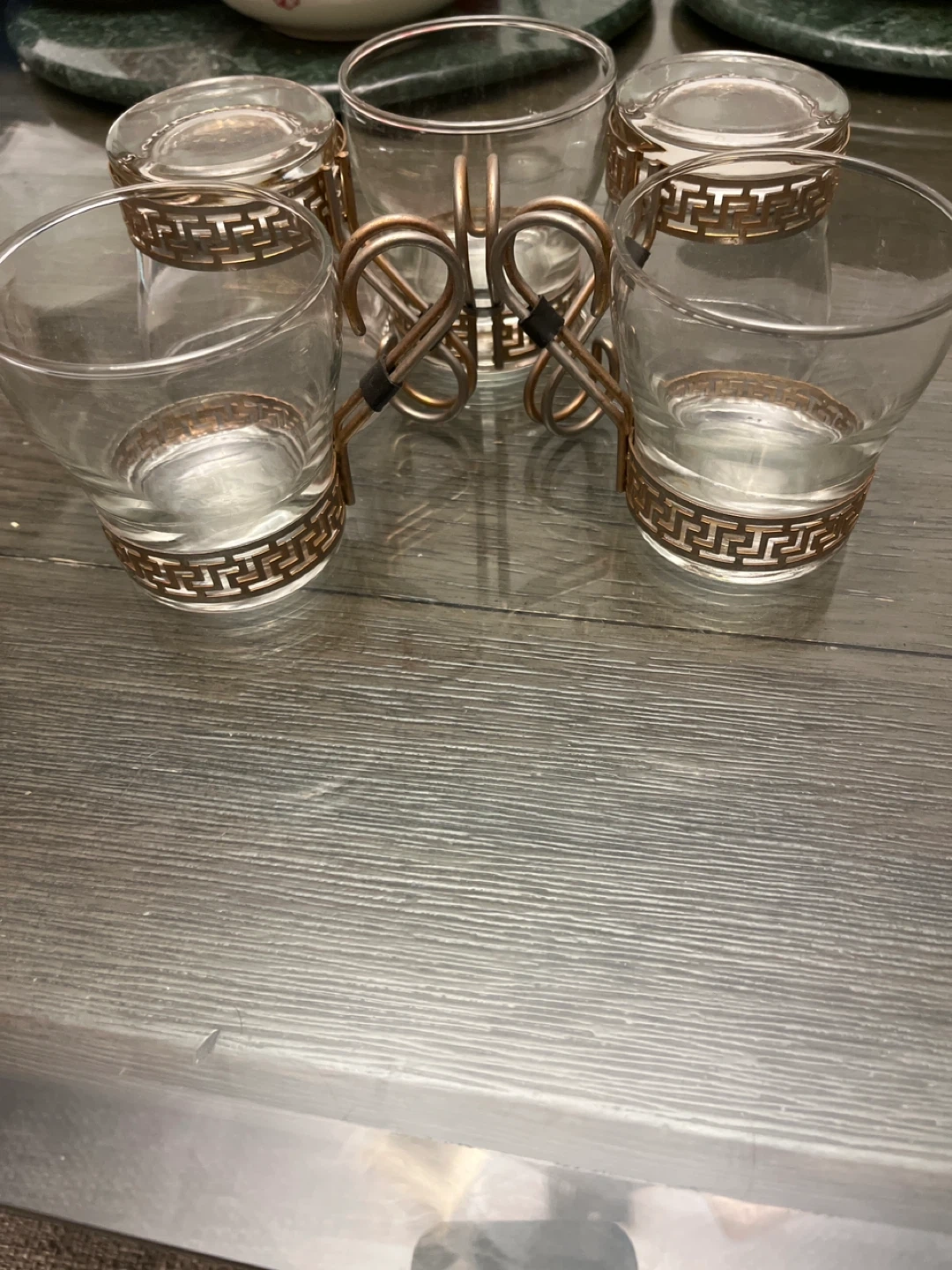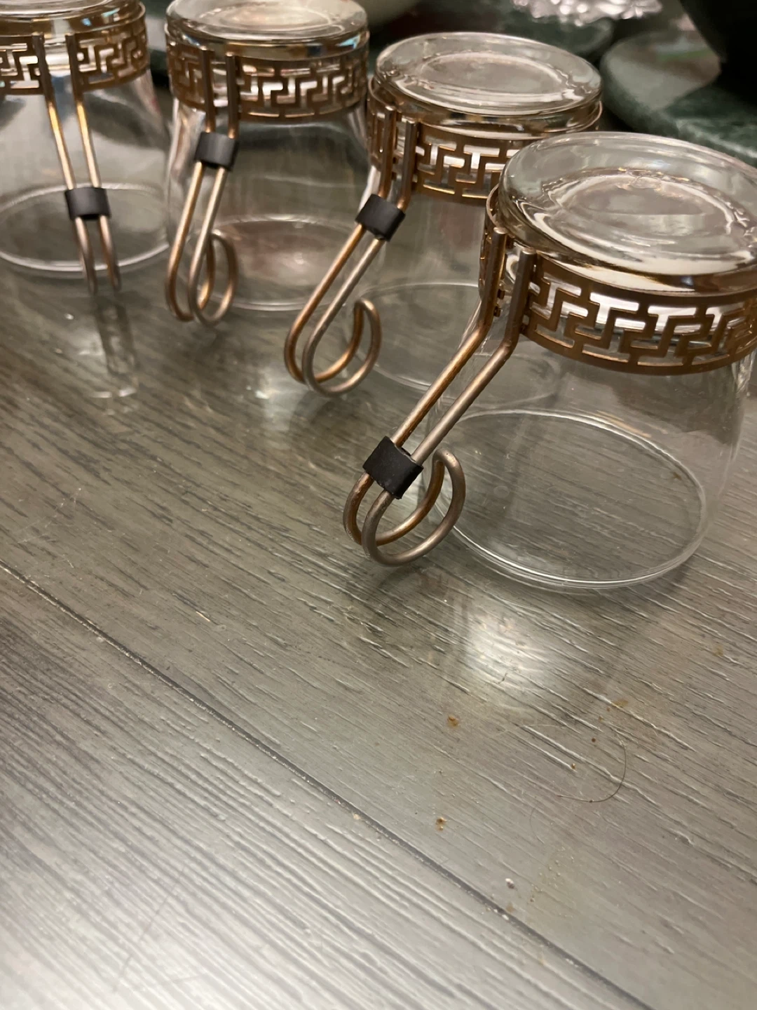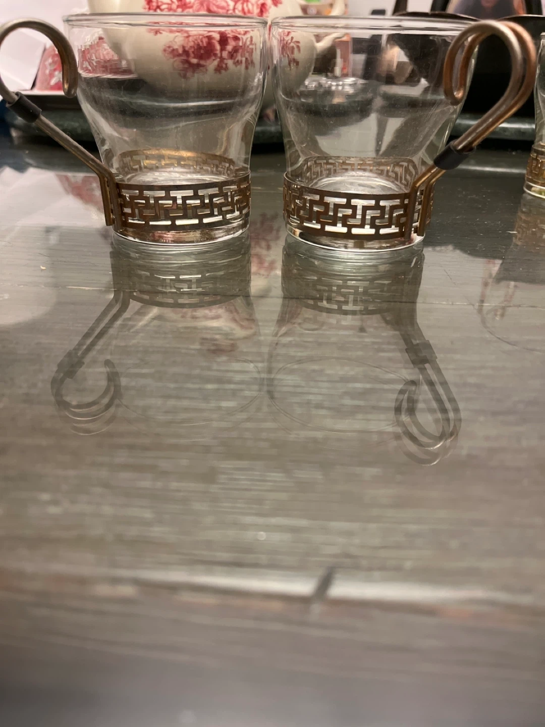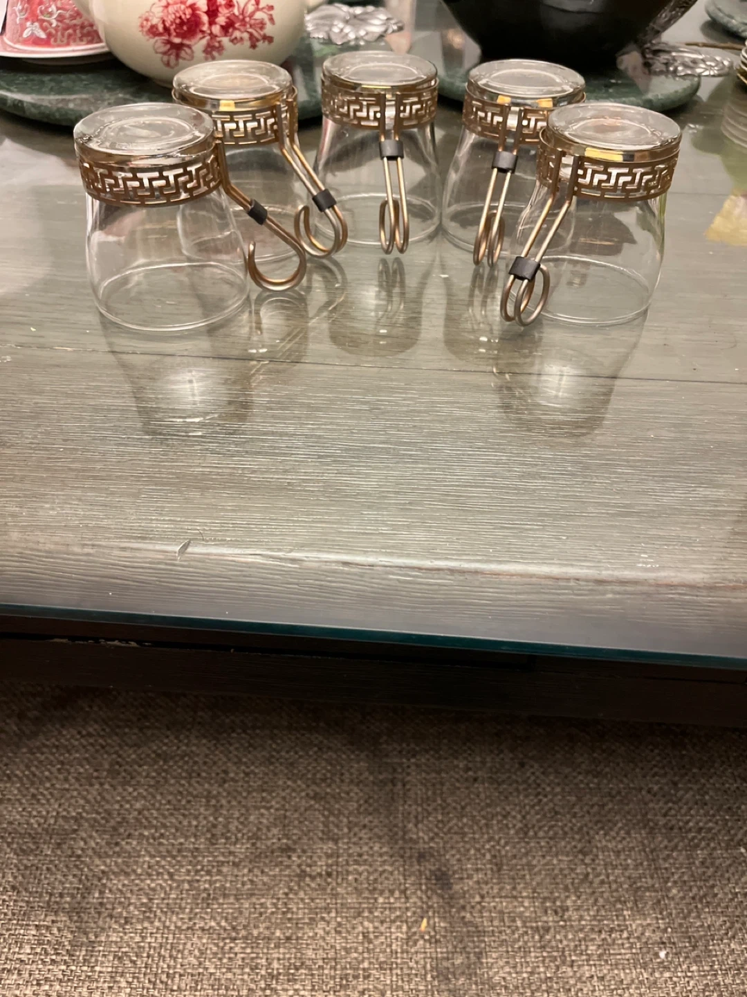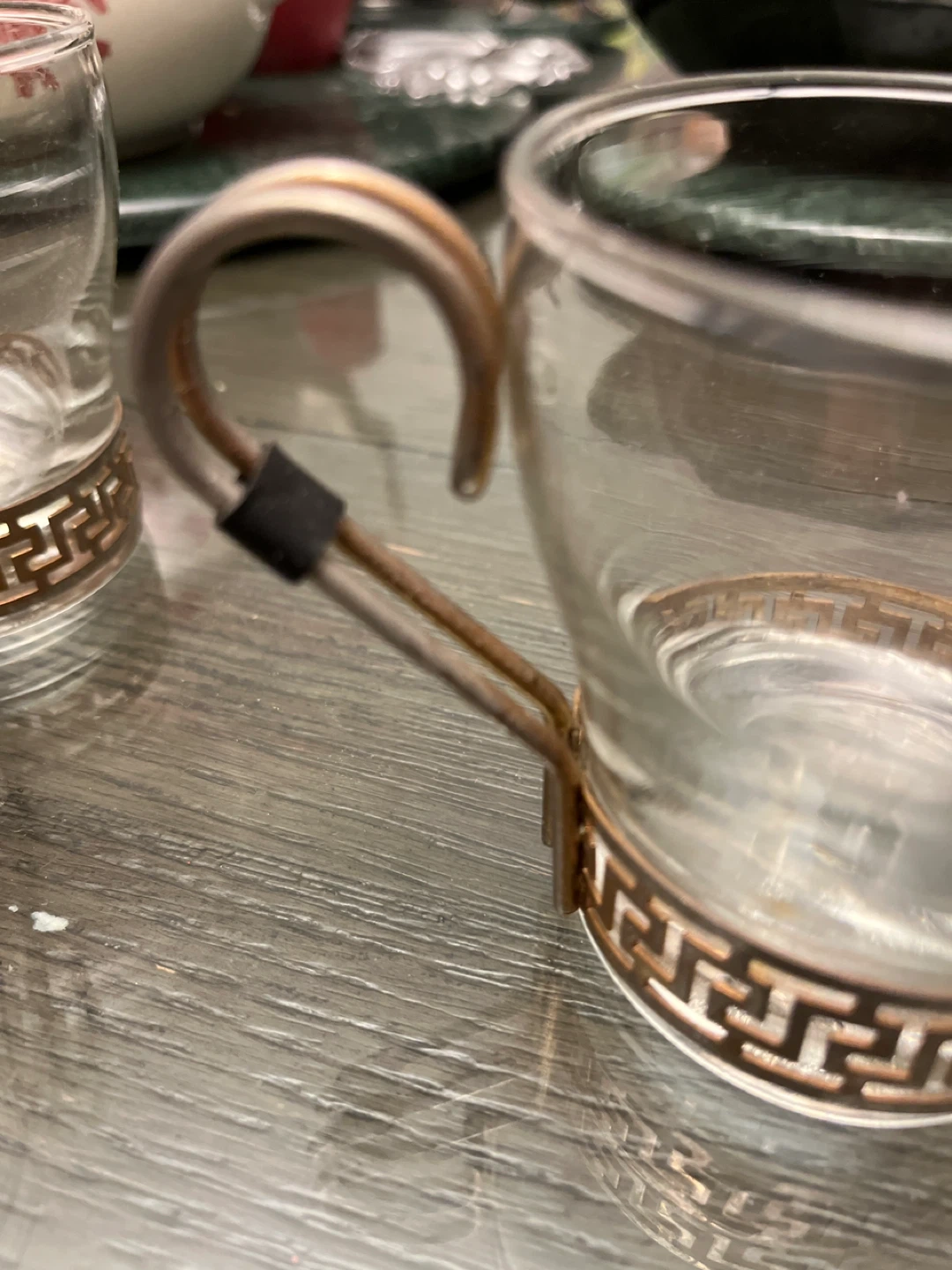 Selling a set of five glass tea cups, each with a unique metal handle design. These cups are perfect for enjoying your favorite hot beverages and adding a touch of elegance to your tea time. They are in great condition and ready for a new home!