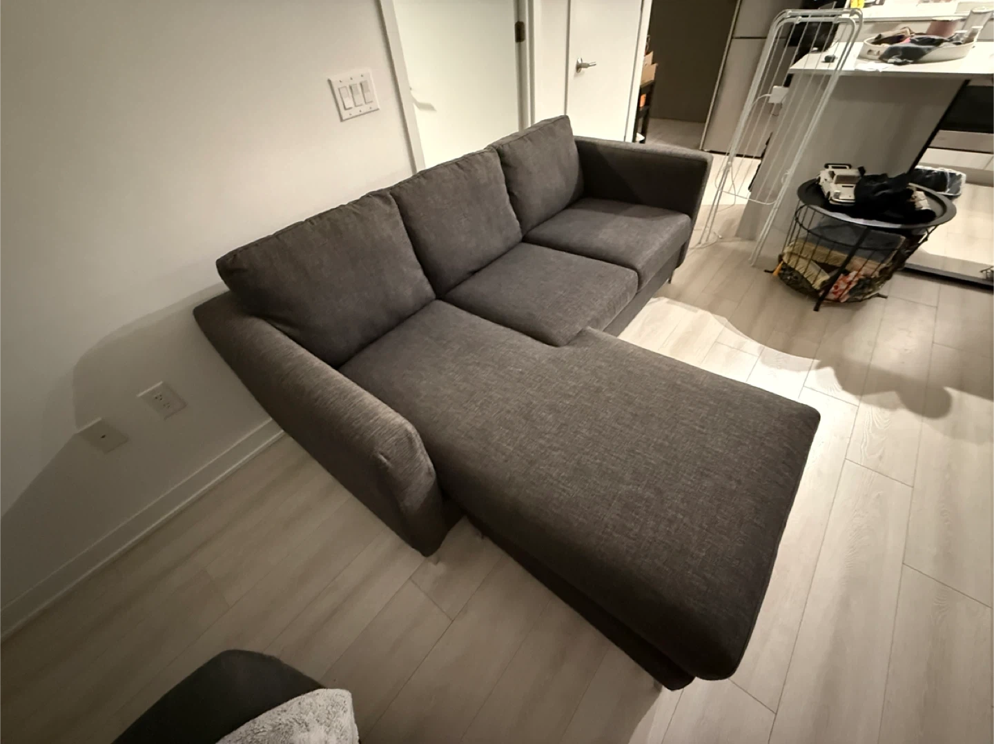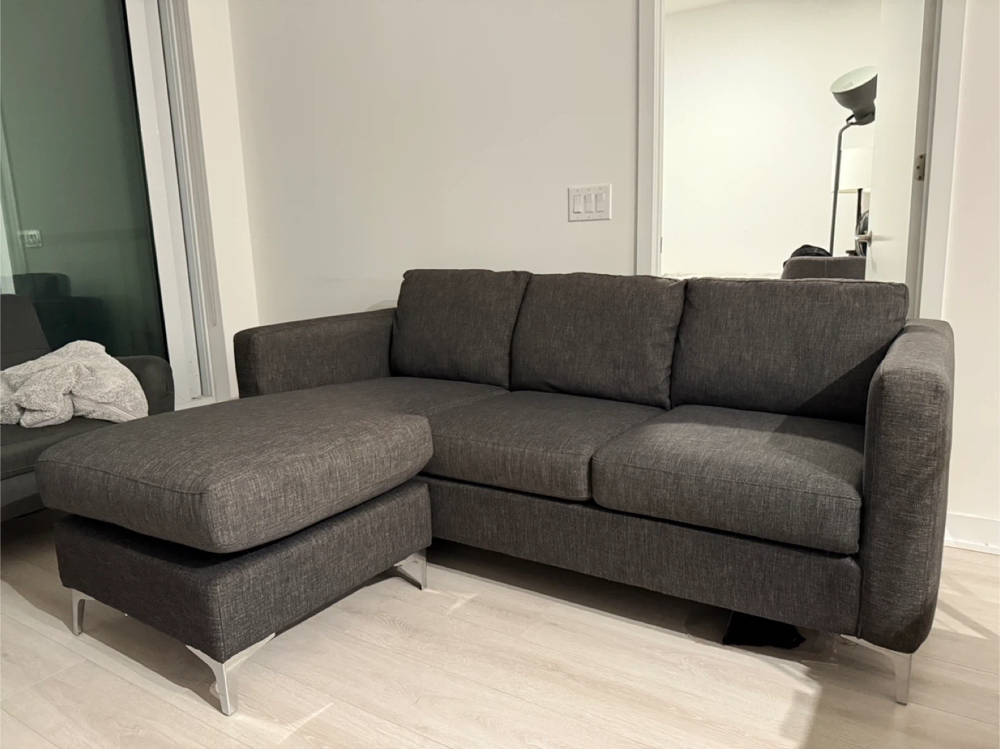 Selling a comfy grey sectional sofa! It features a chaise lounge, perfect for relaxing. It's in great shape and ready for a new home!
