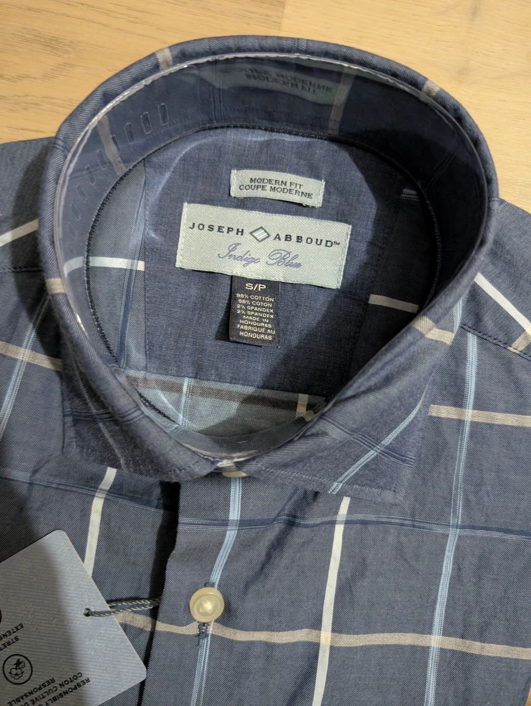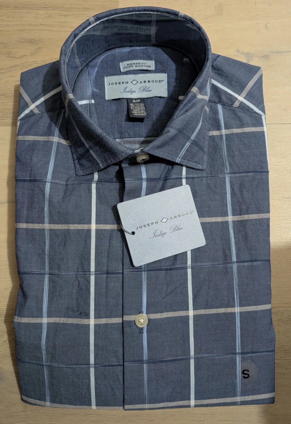 Here's a Joseph Abboud Indigo Blue shirt in size small (S). It features a modern fit and is made from 98% cotton and 2% spandex. Originally bought for $69.99!