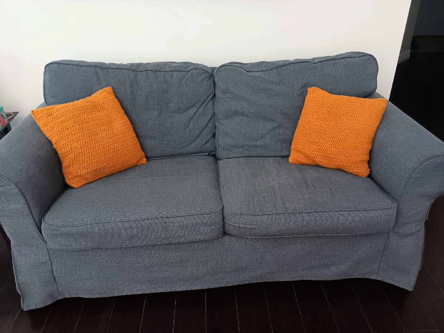 A COMFY grey loveseat sofa - perfect for a smaller space or apartment! It's in good condition and ready for a new home.