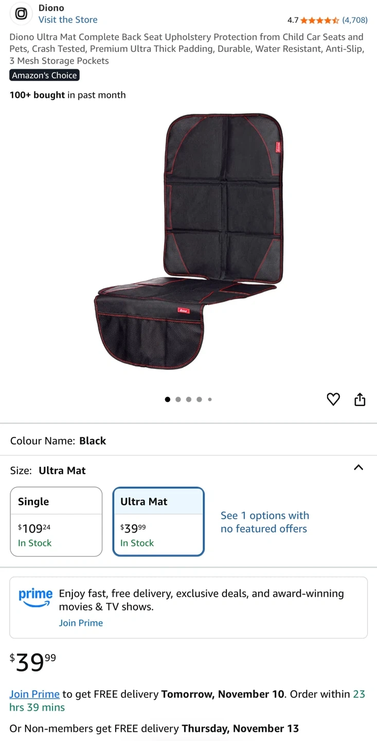Keep your car seats protected with this Diono Ultra Mat! It provides complete back seat upholstery protection from child car seats and pet car seats. It's crash tested, durable, water resistant, and anti-slip. It also has 3 mesh storage pockets!