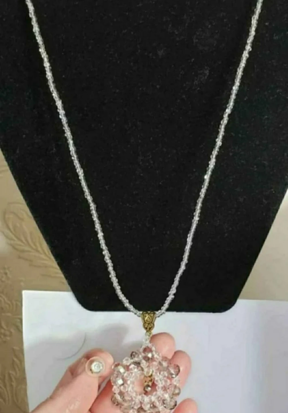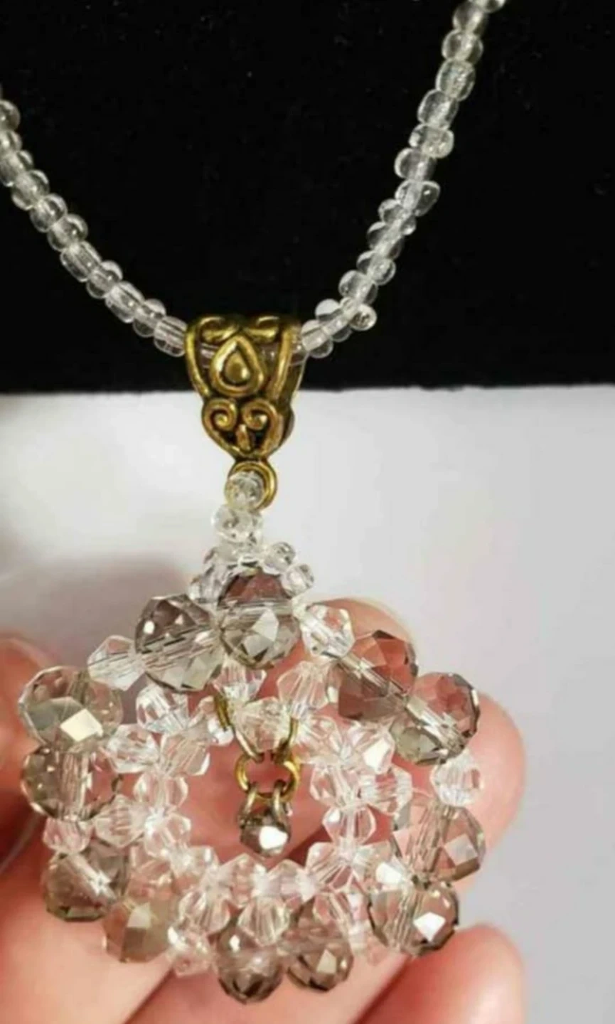 Selling a beautiful handmade beaded necklace. It features clear and silver-toned beads in an eye-catching design. Perfect for adding a touch of elegance to any outfit!