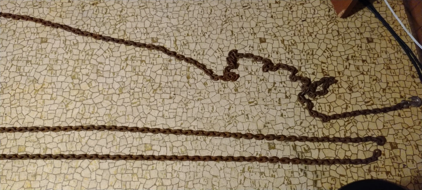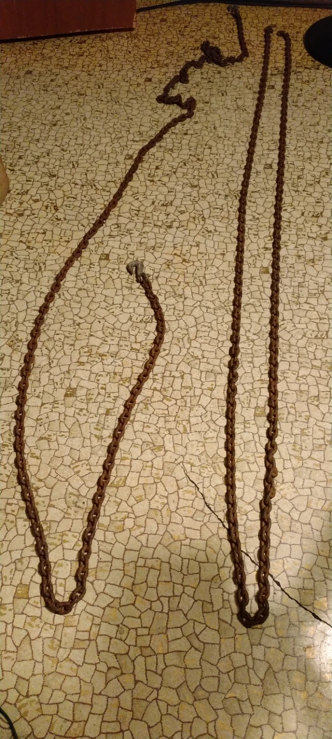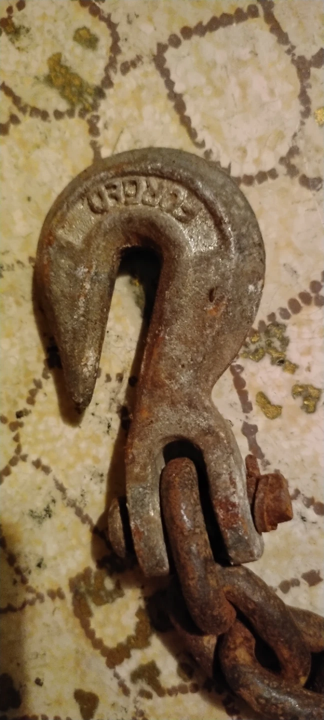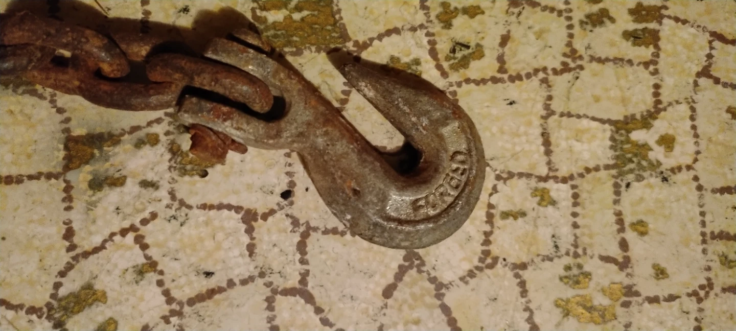 Selling a heavy duty forged chain with a hook. Great for various lifting and securing applications. it's still very strong and functional the chain is approximately 40 ft