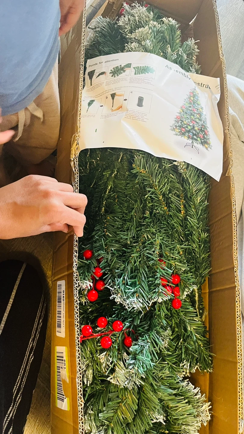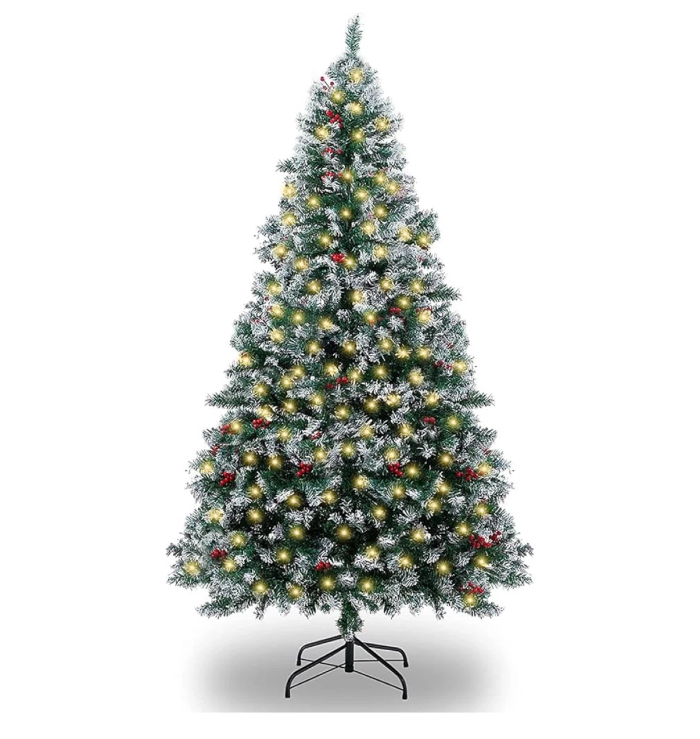 Selling a 6ft Christmas tree with red berries! It comes in its original box with assembly instructions. The tree has snow-flocked white leaf tips for a festive look. It's a lush and full tree with 1000 tips!