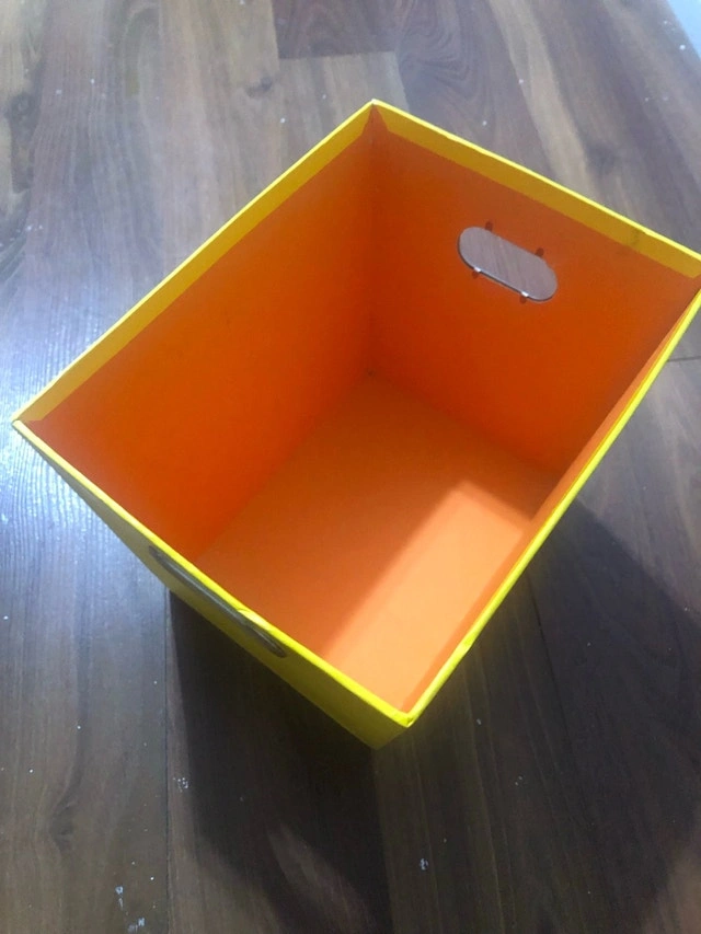 Add a pop of colour and organization to your space with this vibrant yellow and orange storage box! It's perfect for tidying up toys, books, or office supplies. This box is in good condition and ready for a new home. Unfortunately, I don't have the exact dimensions, but it's a standard size for cube storage units.