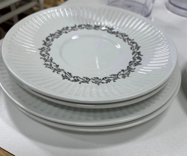 This is a used plate set featuring a charming decorative pattern around the rim, perfect for adding a touch of elegance to your dining experience. These plates are sturdy and ready to be part of your kitchen collection. While they've been previously loved, they're still in great shape and eager to find a new home where they can shine during meal times. Keep in mind that these plates show gentle signs of use, adding a touch of character to their overall appeal. I'm asking $10 for the set.