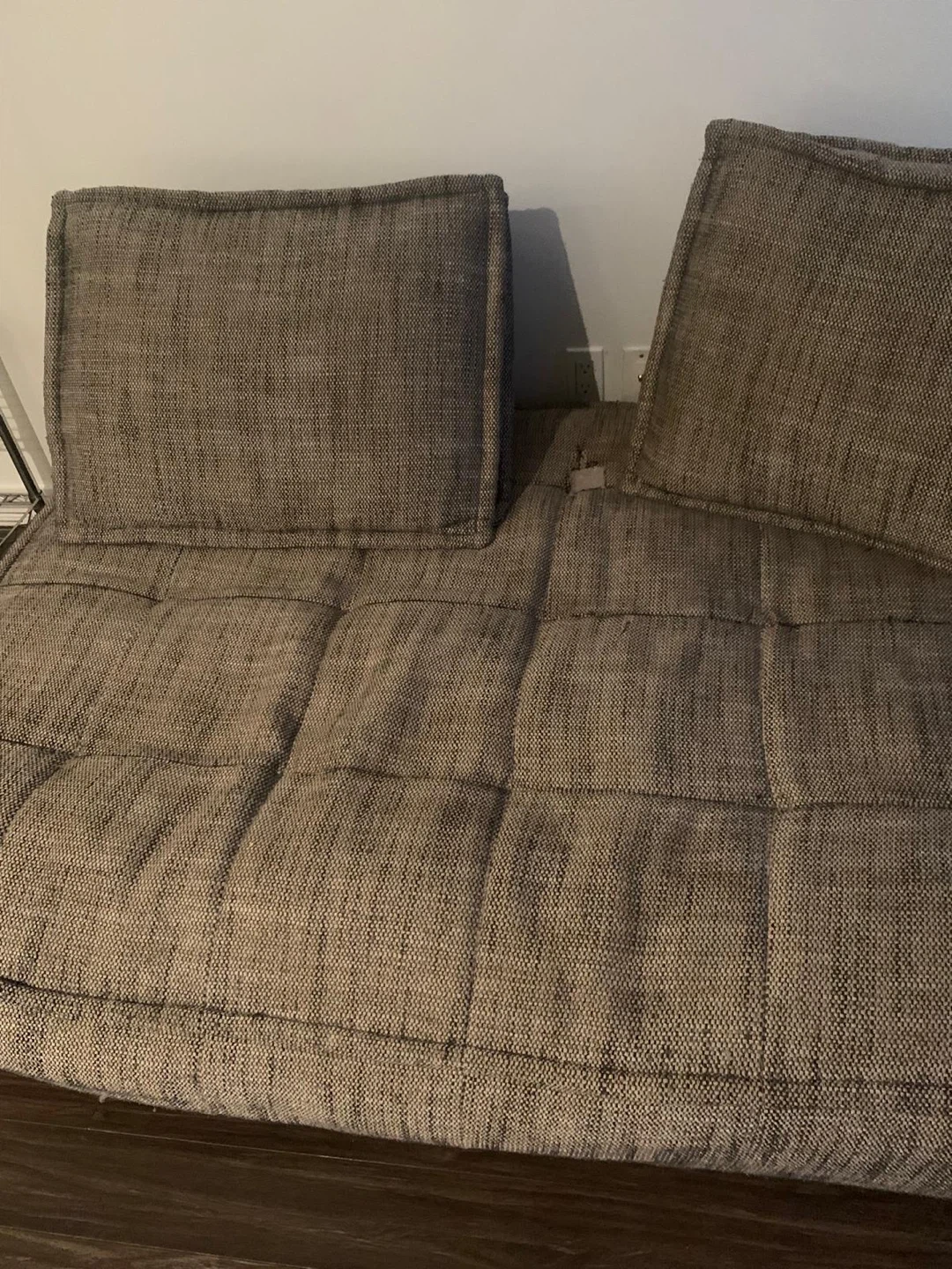 The sofa is a neutral colour and has a comfortable, textured fabric. Has recently been professionally cleaned. Comes with two cushions.