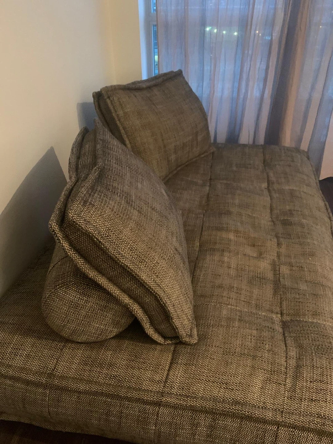The sofa is a neutral colour and has a comfortable, textured fabric. Has recently been professionally cleaned. Comes with two cushions.