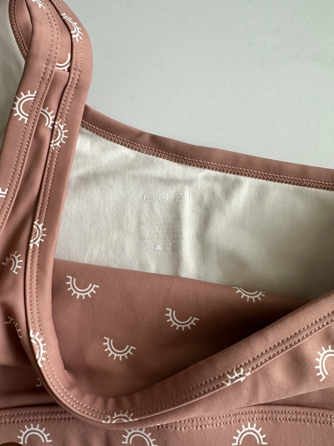 Selling a COZI one-shoulder sport top in size S/P. It features a cute sun pattern and is in great condition