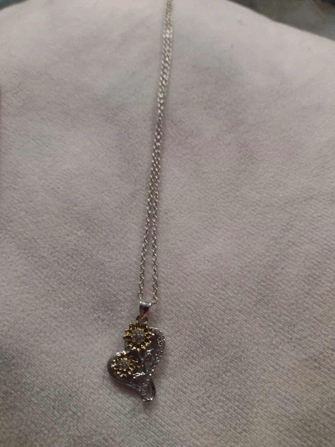 . Selling a pretty heart-shaped pendant necklace (Stainless steel Chain and pendant) with sunflower details! It comes in a box, perfect for gifting or keeping it safe. The necklace has a StainlessSteel chain and a unique design that would look great with any outfit. It comes with matching Sunflower earrings. Great Gift for that Sunflower lover in your life. I put like ew in Ad, but in Actual fact it has never been worn. A bit tight for my neck.