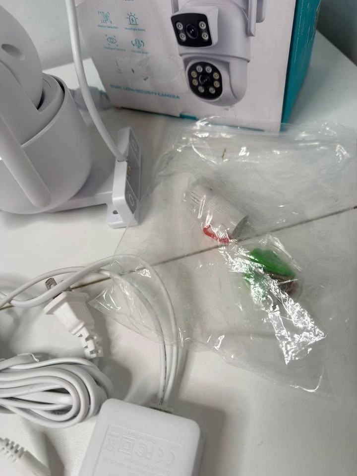 A dual-lens indoor/outdoor security camera with 360° coverage and dual-screen viewing for complete area monitoring. The 6MP (3MP+3MP) resolution delivers sharp, full-color night vision up to 65 ft. Features motion detection, real-time alerts, two-way audio, and multi-user sharing via the iCSee app. Supports SD card or cloud storage, works with Alexa, and connects via Wi-Fi or Ethernet for stable performance.
