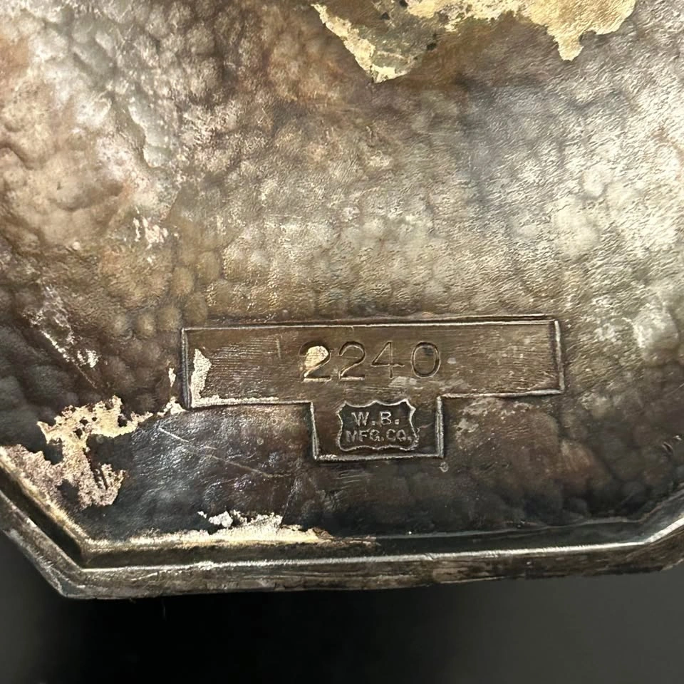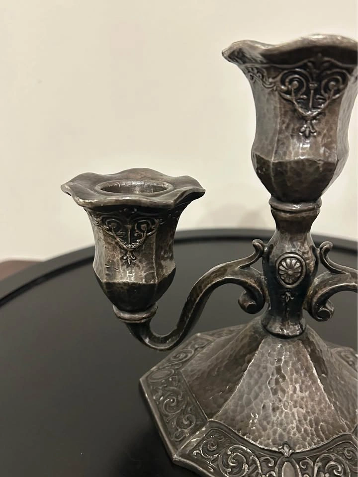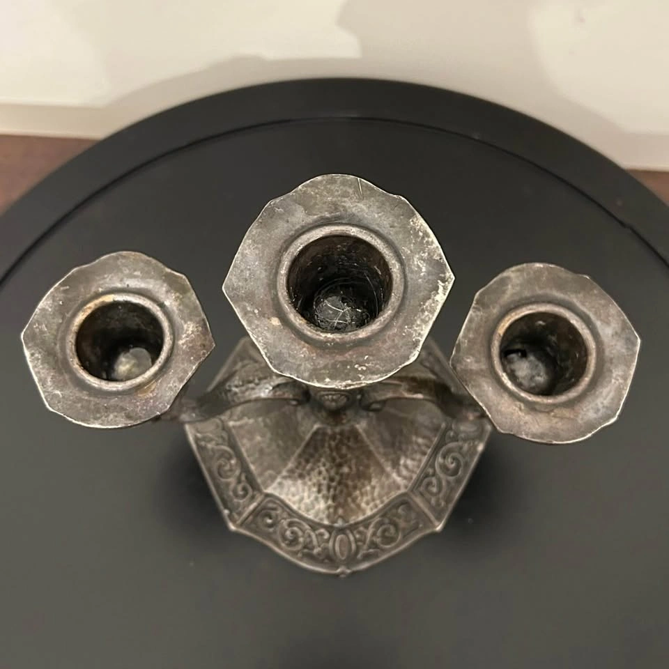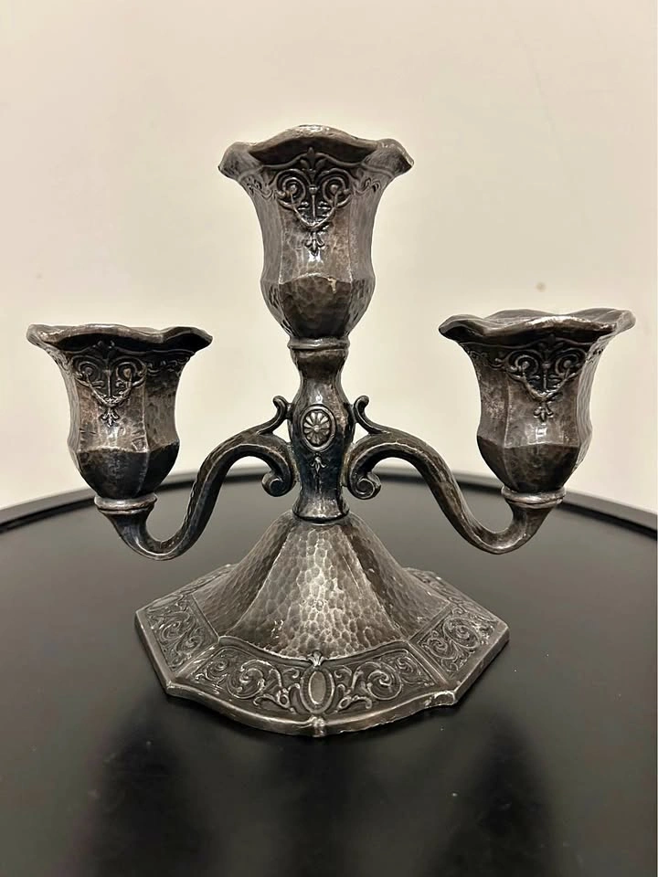 Elegant vintage pewter 3-arm candelabra by W.B. Manufacturing Co., marked 2240 on the base. Features a beautiful hammered texture and ornate embossed floral and scrollwork patterns on the arms and base. The design combines Art Nouveau and Gothic Revival influences, giving it a classic and timeless appeal.